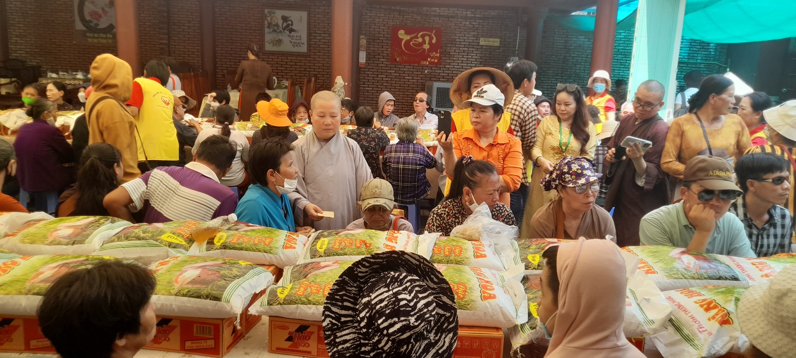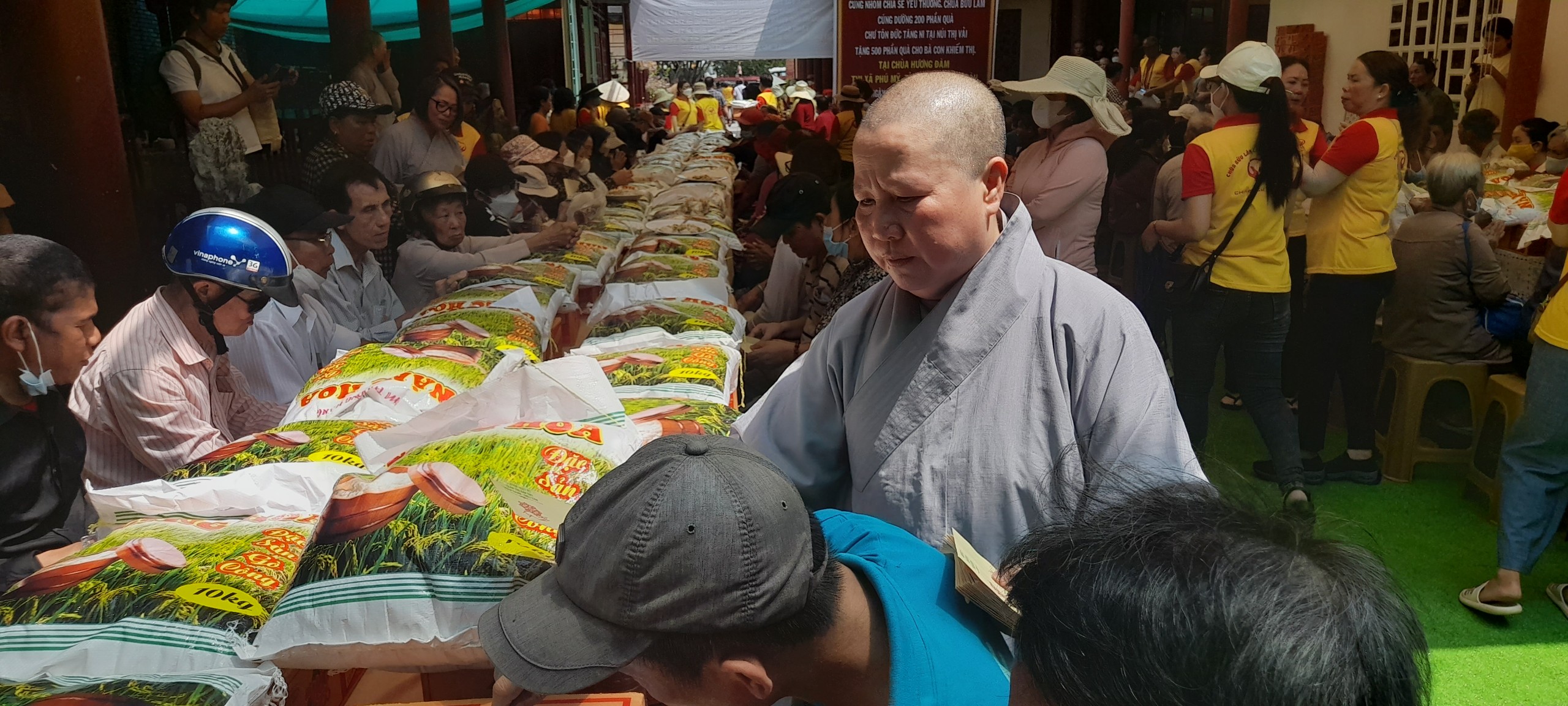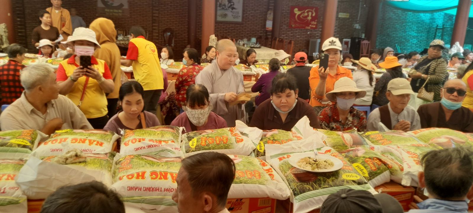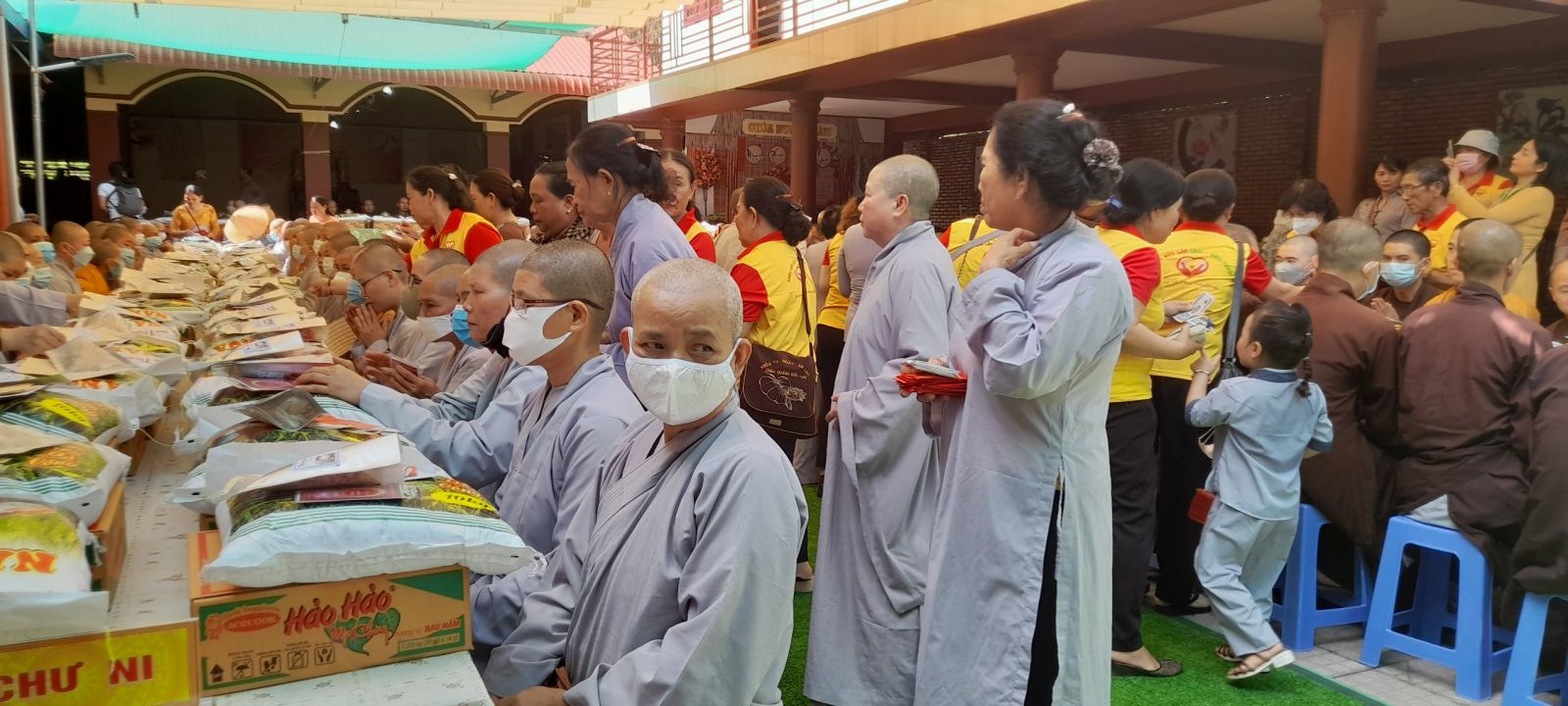 Tổng giá trị mỗi phần quà cúng dường chư tôn đức Tăng Ni là 600.000đ bao gồm: tịnh tài, 1 thùng mì, 10 kg gạo, bánh mứt.