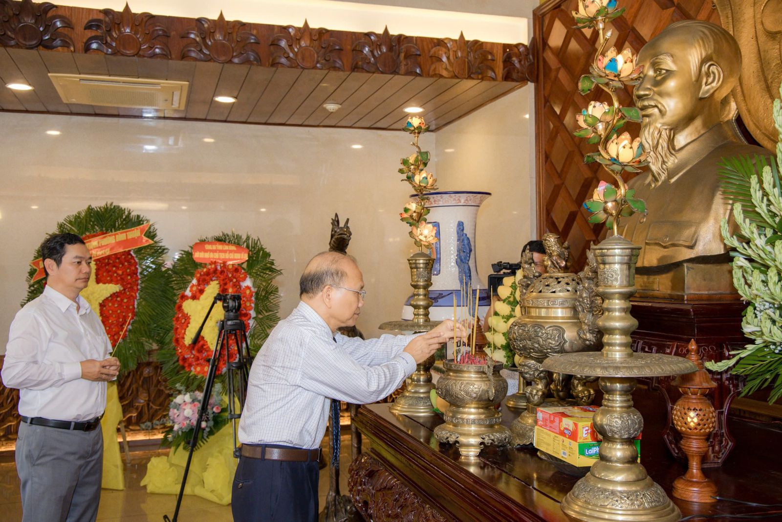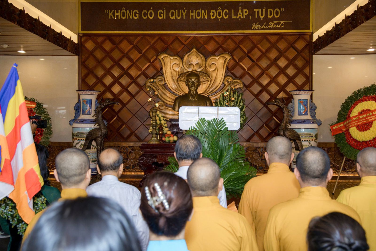 Trong không khí trang nghiêm và thành kính, chư Tôn đức giáo phẩm cùng các vị lãnh đạo đã trang trọng đặt lẵng hoa, dâng hương tưởng niệm Chủ tịch Hồ Chí Minh – vị lãnh tụ vĩ đại, người Cha già kính yêu của dân tộc Việt Nam. Trước anh linh của Bác, toàn thể phái đoàn đã dành phút mặc niệm, thể hiện lòng tri ân sâu sắc đối với công lao trời biển của Người trong sự nghiệp đấu tranh giành độc lập dân tộc, thống nhất đất nước, đem lại hòa bình và hạnh phúc cho nhân dân Việt Nam.