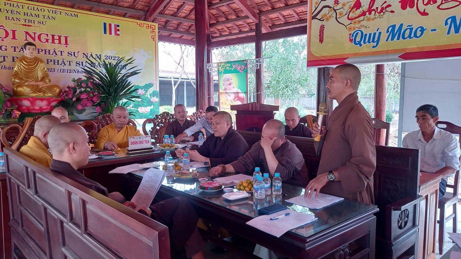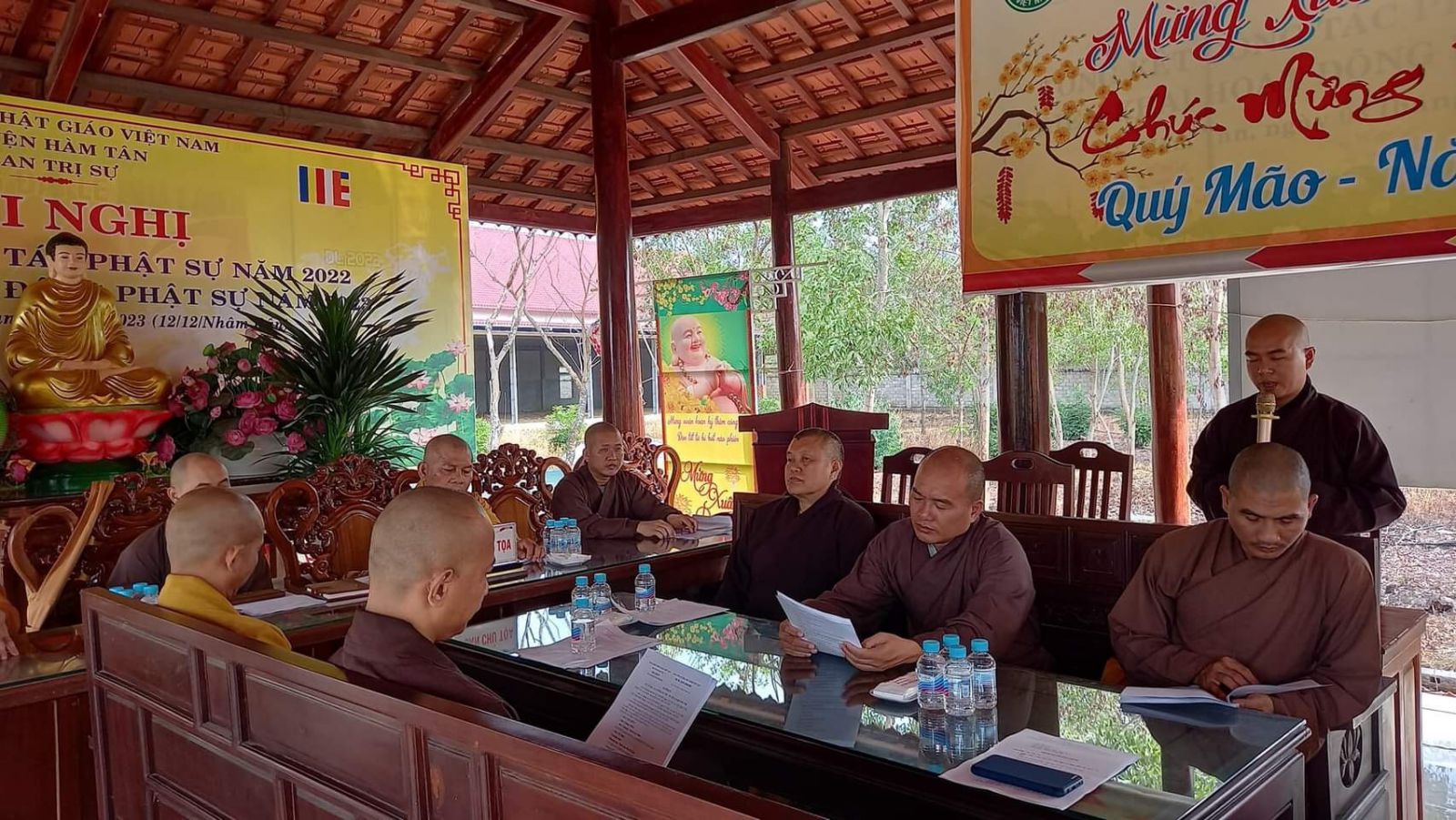 Chư Tôn đức tham dự phiên họp đã đóng góp ý kiến đề xuát chương trình, thời gian và địa điểm tổ chức Đại lễ Phật đản và An cư Kiết hạ PL. 2567 – DL. 2023 cho Tăng Ni Phật giáo huyện Hàm Tân dự kiến như sau: