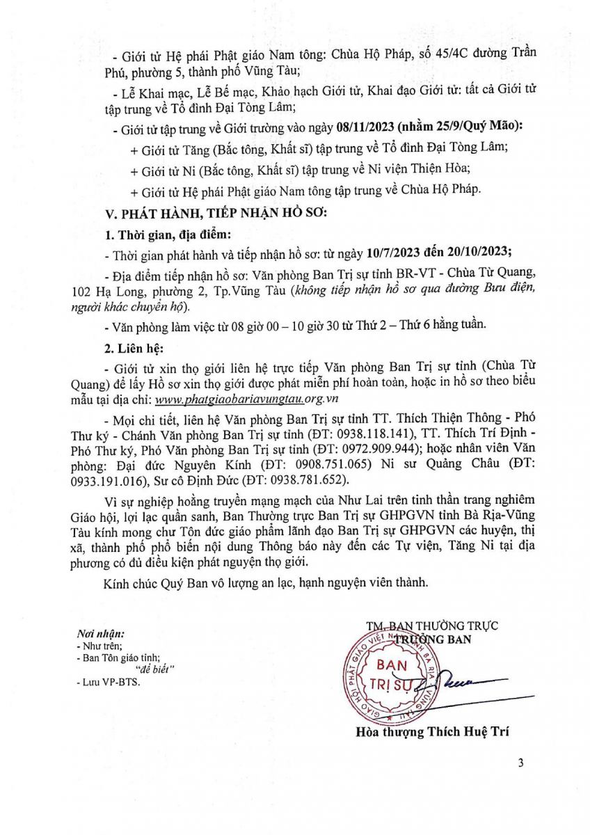 Ban Tổ chức phát hành và tiếp nhận hồ sơ từ ngày 10-7-2023 đến 20-10-2023, tại Văn phòng Ban Trị sự tỉnh - chùa Từ Quang, 102 Hạ Long, phường 2, TP.Vũng Tàu, từ 8 giờ – 10 giờ 30 từ thứ Hai đến thứ Sáu hàng tuần (không tiếp nhận hồ sơ qua đường Bưu điện, người khác chuyển hộ).