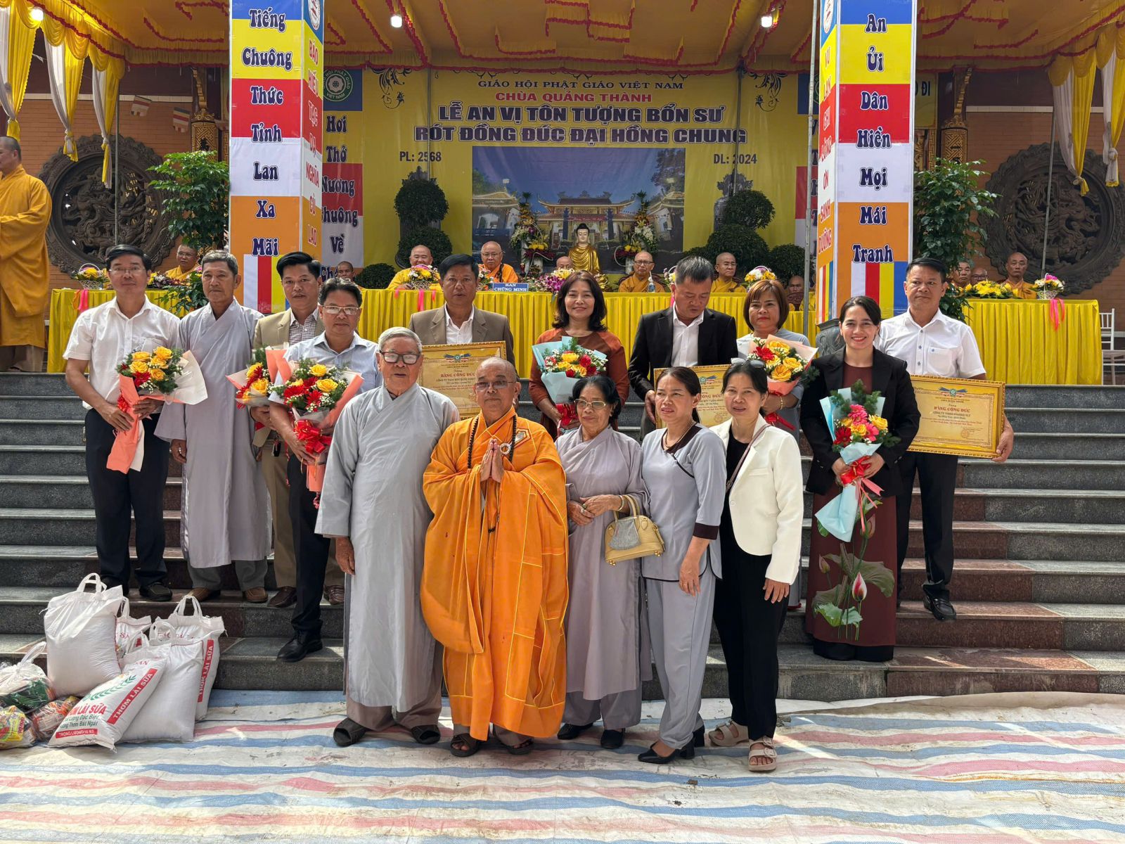 Bên cạnh đó buổi lễ cũng ghi nhận những phần quà những lẵng hoa chúc mừng của đại diện lãnh đạo Giáo hội các cấp, lãnh đạo địa phương, chư Tăng đồng học pháp lữ, tông môn. Sau đó chư tôn đức đã quang lâm Đại hùng bảo điện thực hiện nghi thức thiền môn sái tịnh an vị tôn tượng Phật, và đúc đồng đại hồng chung.