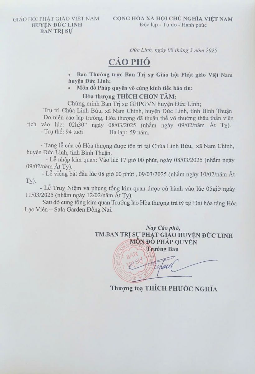 Thượng tọa Thích Phước Nghĩa, Trưởng ban Trị sự GHPGVN H.Đức Linh và môn đồ pháp quyến cáo phó kính tiếc báo tin Hòa thượng Thích Chơn Tâm - Giáo Phẩm Chứng Minh Ban Trị sự GHPGVN huyện Đức Linh, trụ trì chùa Linh Bửu, xã Nam Chính viên tịch vào ngày 08/03/2025.
