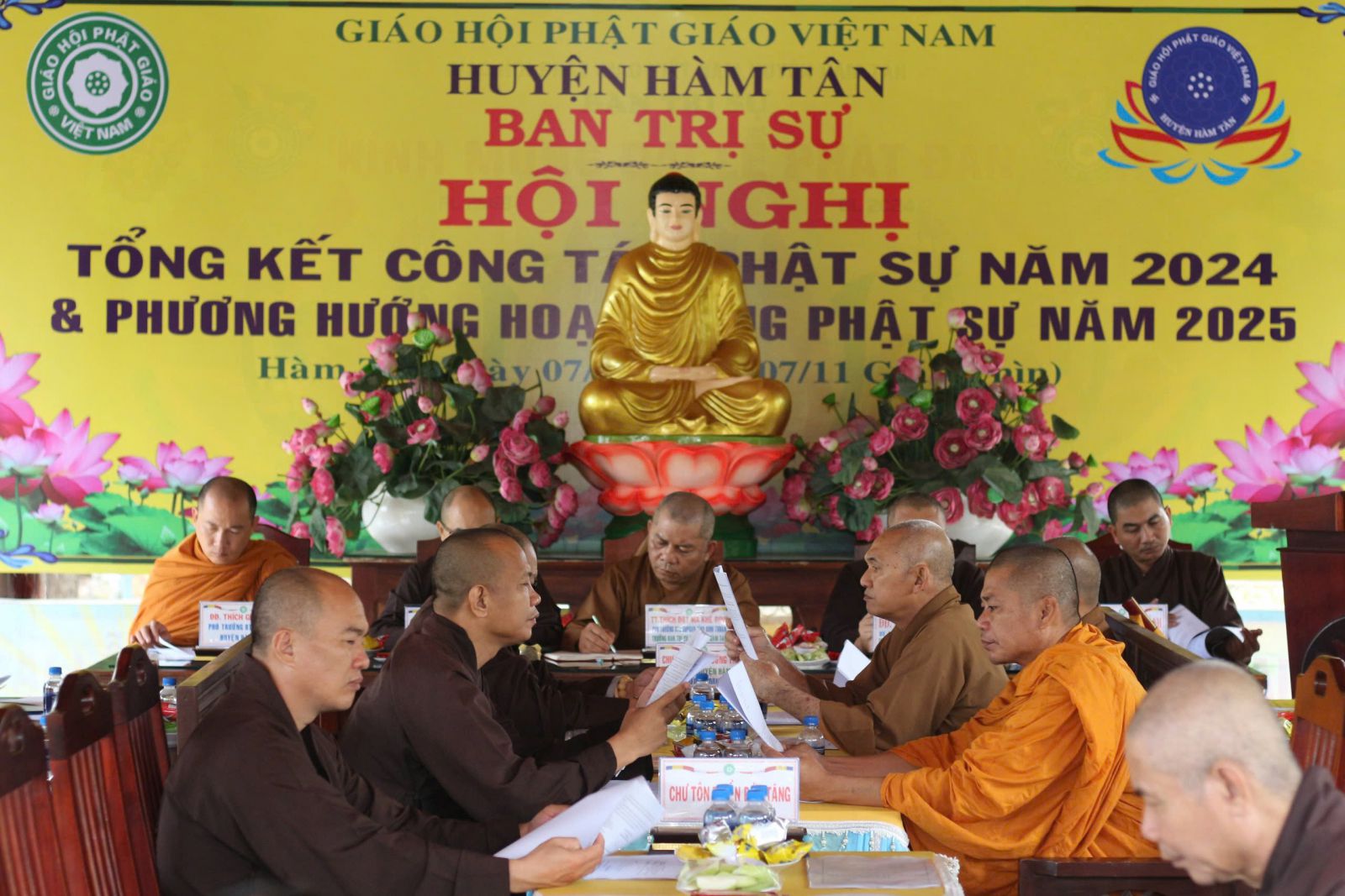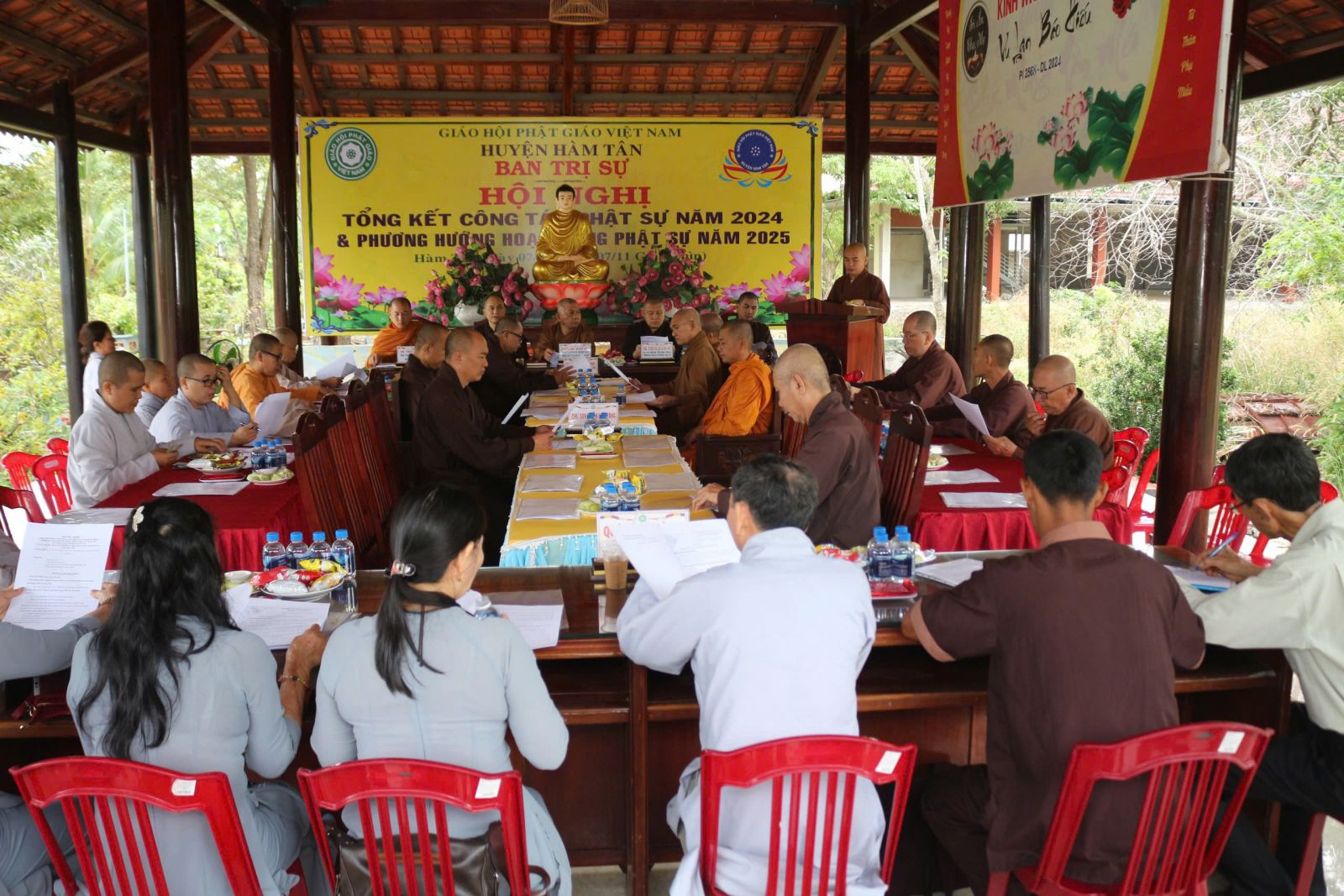Theo đó, toàn huyện có 155 Tăng, Ni; 28 cơ sở tự viện, trong đó, 2 cơ sở chưa có trụ trì là Chùa Thạch Long và Tịnh Xá Ngọc Minh. Năm 2024, BTS PG huyện Hàm Tân đã tổ chức 1 Trường hạ và 2 điểm an cư cho 98 hành giả tu học, sinh hoạt mỗi tháng 4 kỳ. Tổ chức tuần lễ cấm túc an cư từ ngày 23/5 đến hết ngày 03/5 năm Giáp Thìn. Ngoài 3 tháng An cư Kiết hạ chư Tăng – Ni huyện Hàm Tân hằng tháng đều định kỳ hội họp để Bố tát tụng giới, chư Tăng tại Vp BTS - Tổ đình Quảng Ân, chư Ni luân phiên các tự viện ni giới trong huyện.