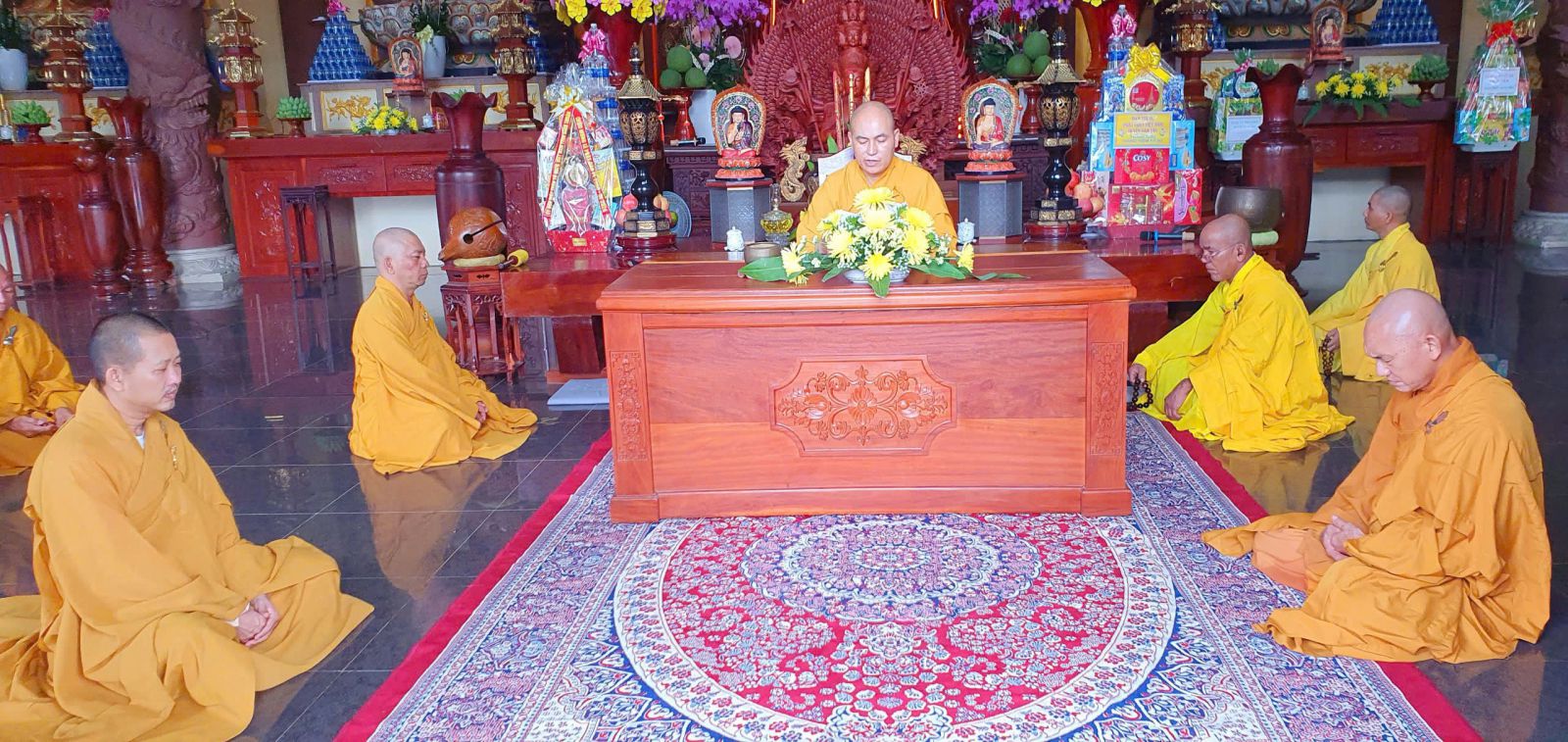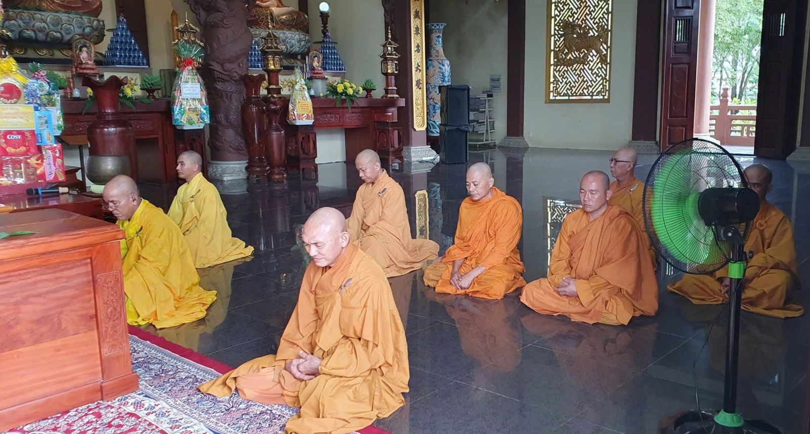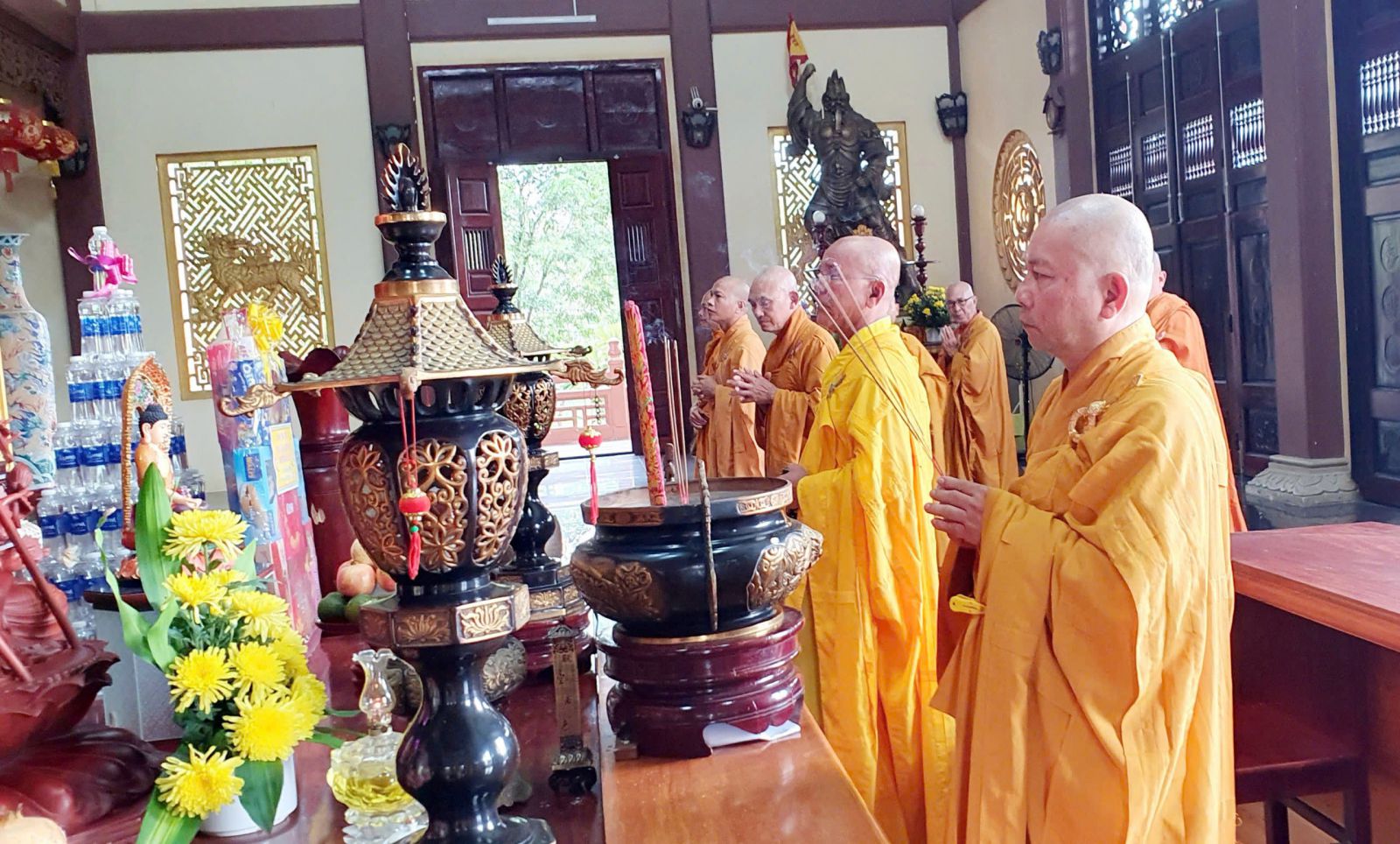 Sau khi đảnh lễ Tổ sư tại tổ đường, chư Tăng tuần tự vân tập chánh điện. Thượng tọa Thích Đạt Ma Khế Định, Phó trưởng BTS GHPGVN tỉnh Bình Thuận, Trưởng BTS GHPGVN huyện Hàm Tân niêm hương bạch Phật và dành một phút mặc niệm tưởng nhớ các nạn nhân bị thiệt mạng do bão Yagi gây ra.