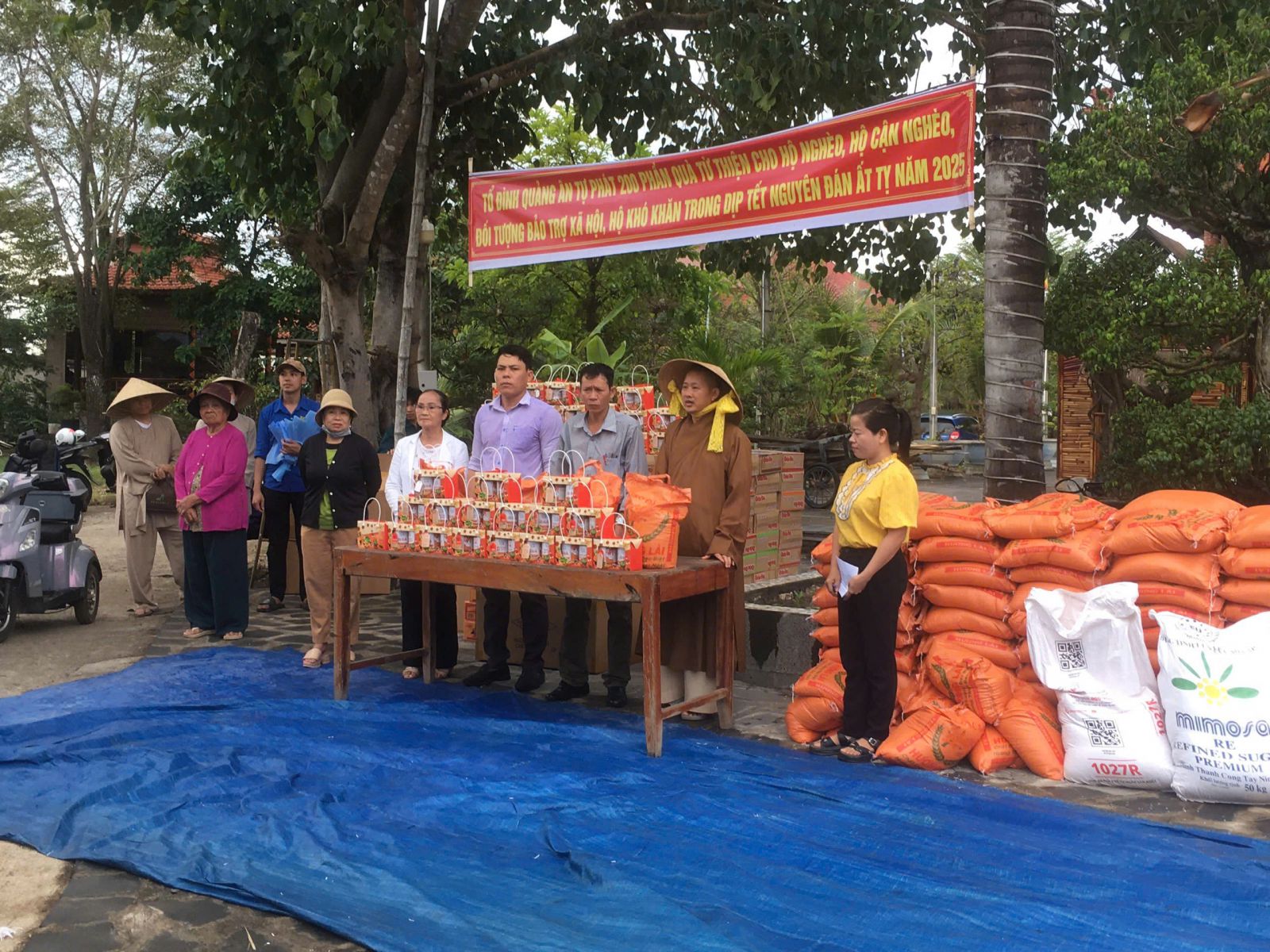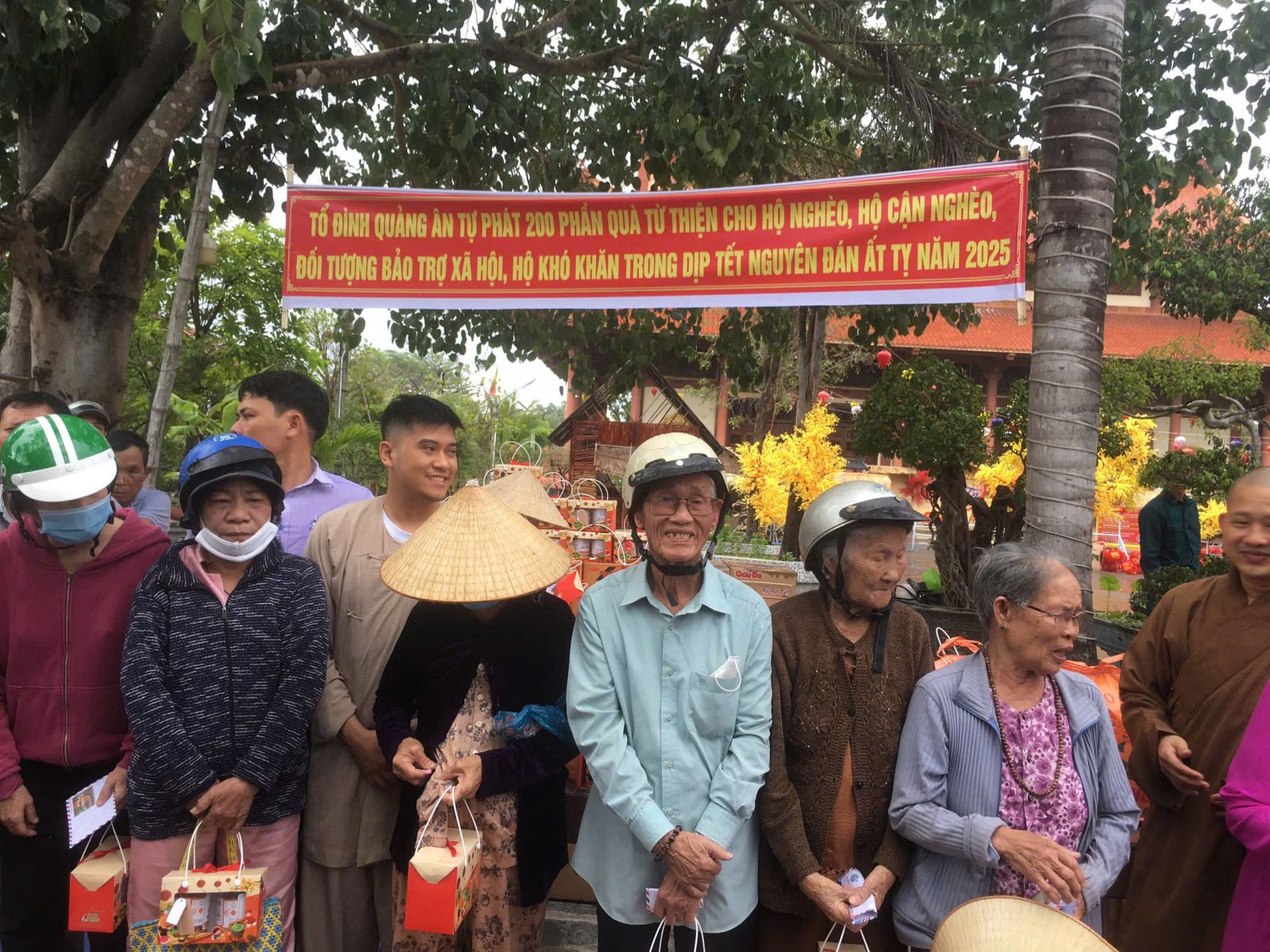 Trước thềm xuân Ất Tỵ năm 2025, sáng ngày rằm tháng Chạp (14/01/2025), Đạo tràng Tổ đình Quảng Ân (thị trấn Tân Nghĩa) phối hợp cùng UBND thị trấn Tân Nghĩa trao tặng 200 phần quà đến bà con có hoàn cảnh khó khăn tại địa phương.
