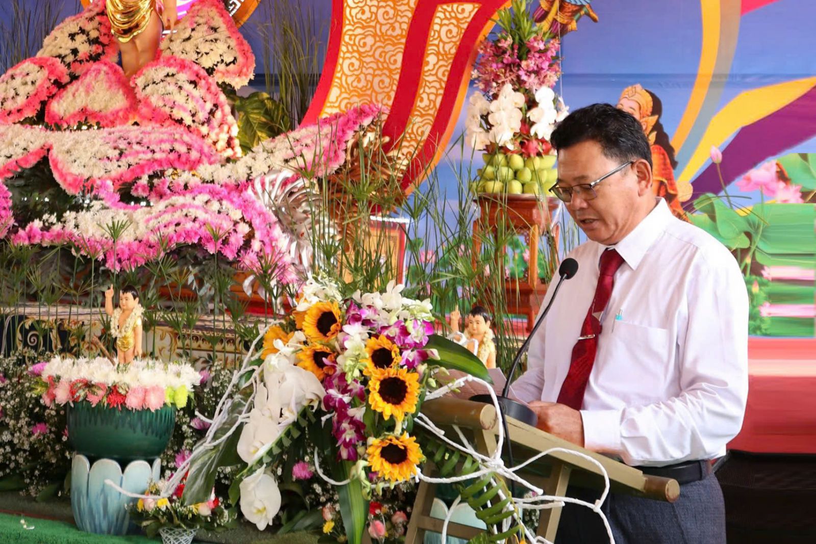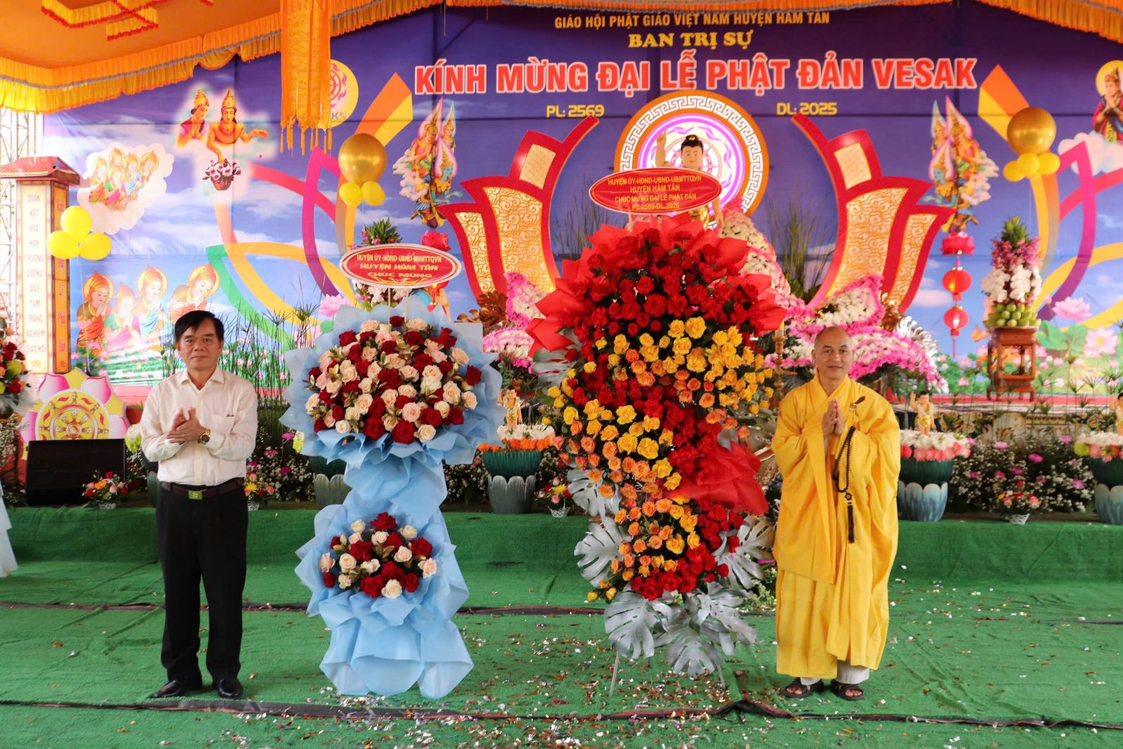 Ông Mai Tấn Quốc, Chủ tịch MTTQVN huyện Hàm Tân, phát biểu: “Đại lễ Vesak không chỉ là dịp để các Phật tử tôn vinh Đức Phật mà còn là cơ hội để chúng ta cùng nhau hướng dẫn về những giá trị tốt đẹp, xây dựng cộng đồng hòa bình và yêu thương.”