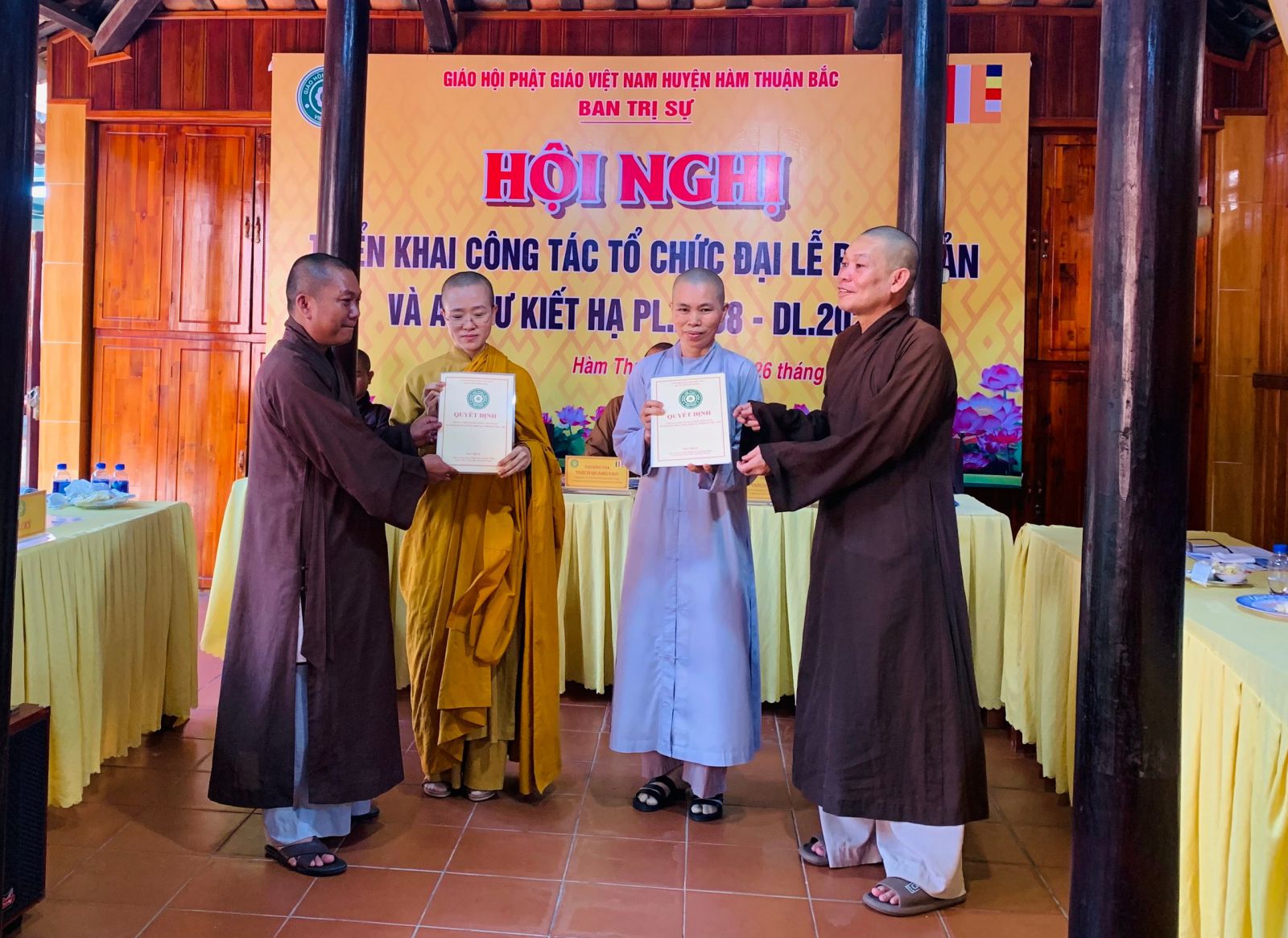 Dịp này, Thay mặt Thường trực Ban Trị sự GHPGVN H. Hàm Thuận Bắc, Thượng tọa Thích Nhuận Thông và Thượng tọa Thích Nguyên Trí đã trao quyết định bổ sung nhân sự Ủy viên Thư ký Ban Trị sự GHPGVN huyện Hàm Thuận Bắc, Nhiệm kỳ 2021-2026 đến Sư cô Thích nữ Huệ GIác và Sư cô Thích nữ Liên Anh.