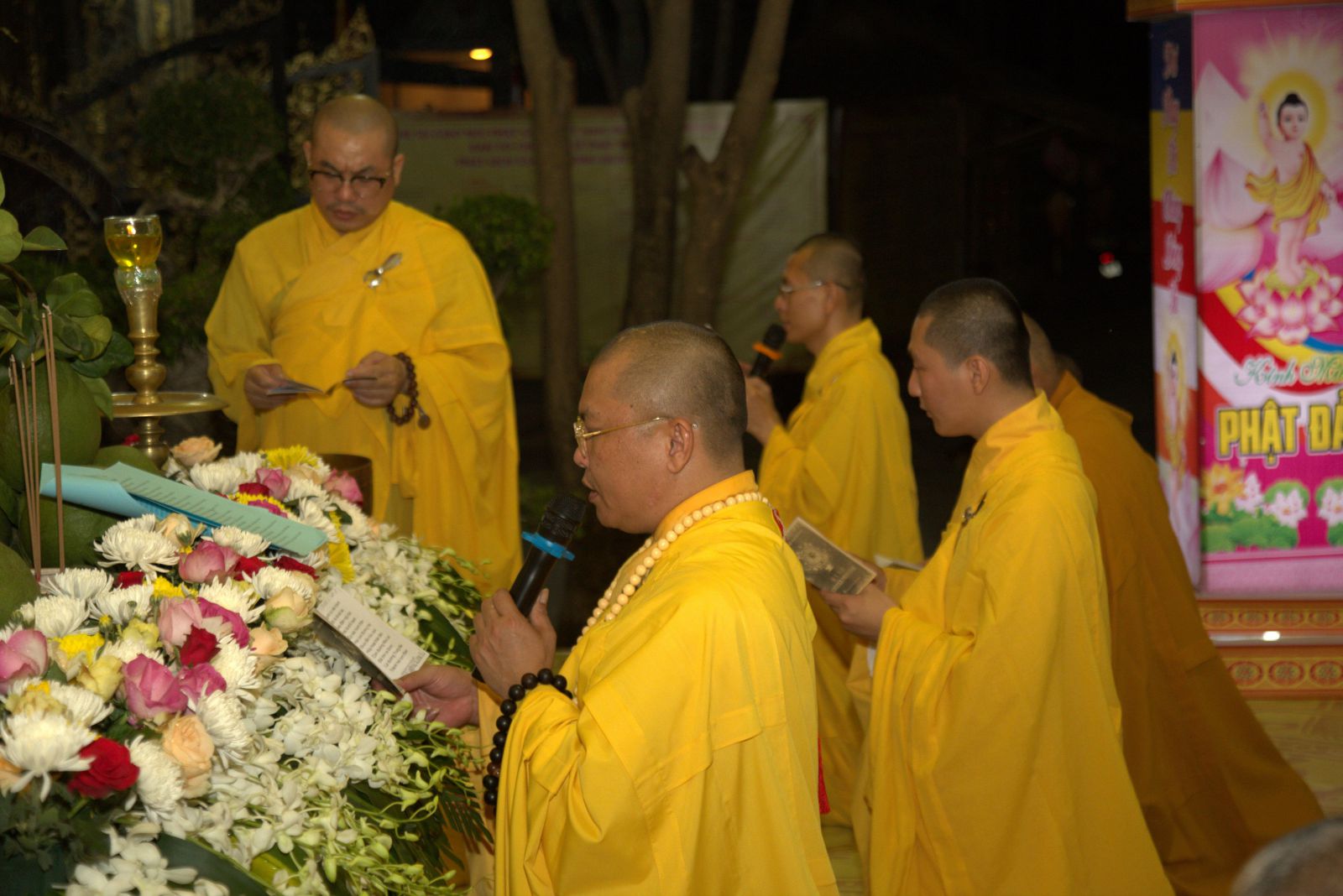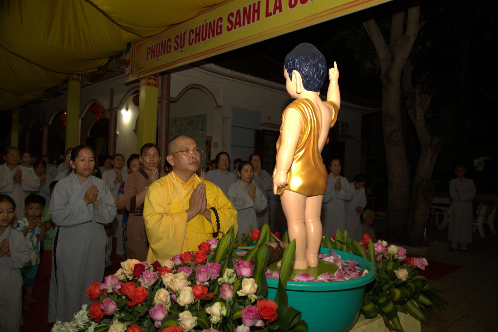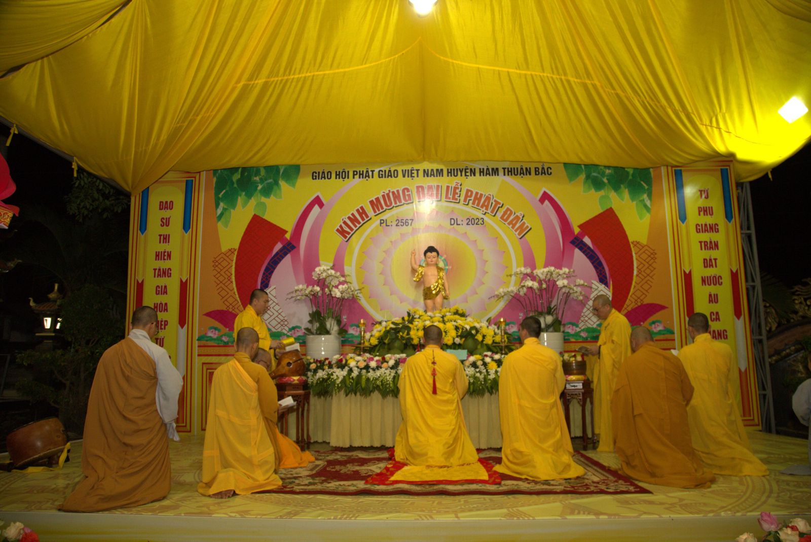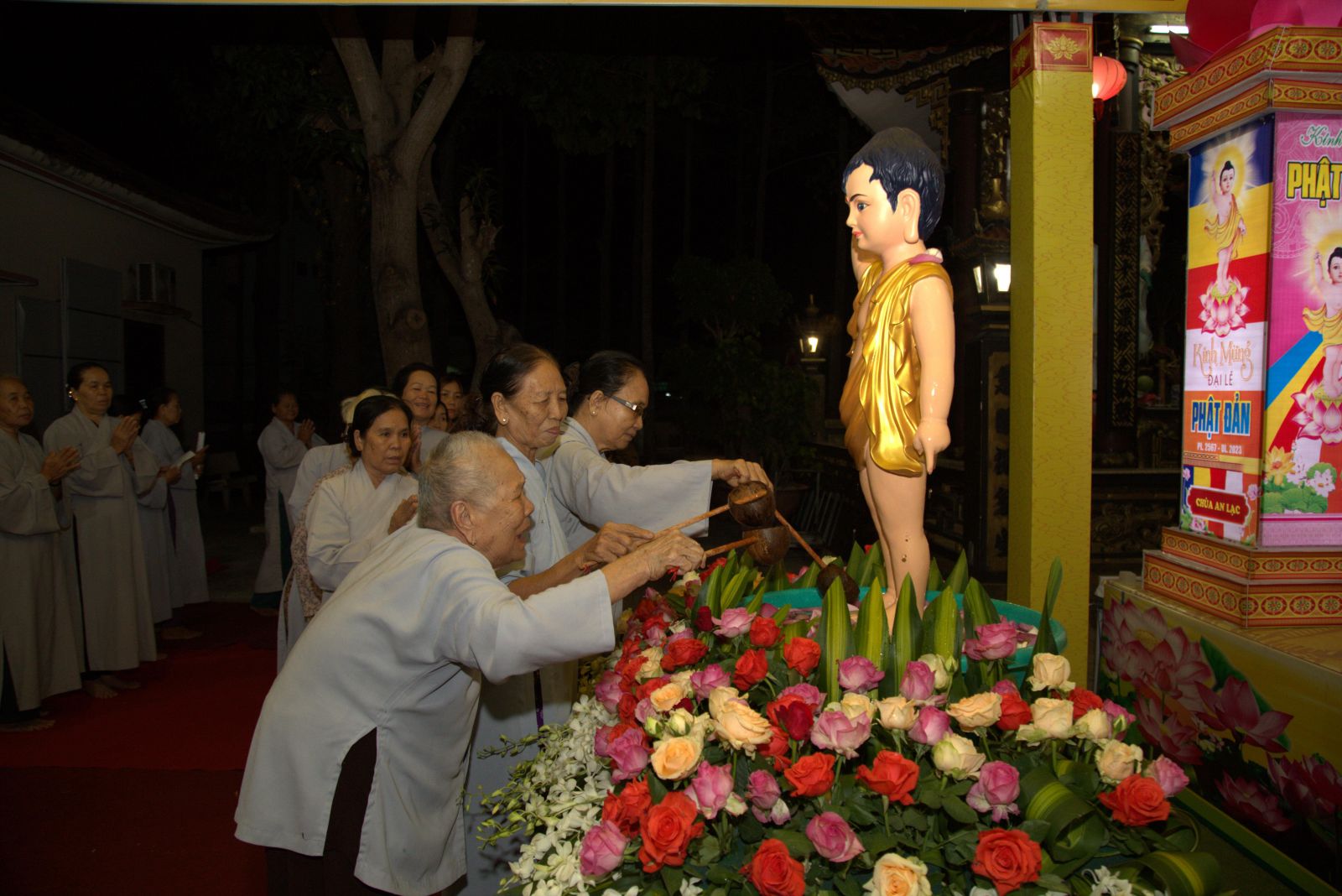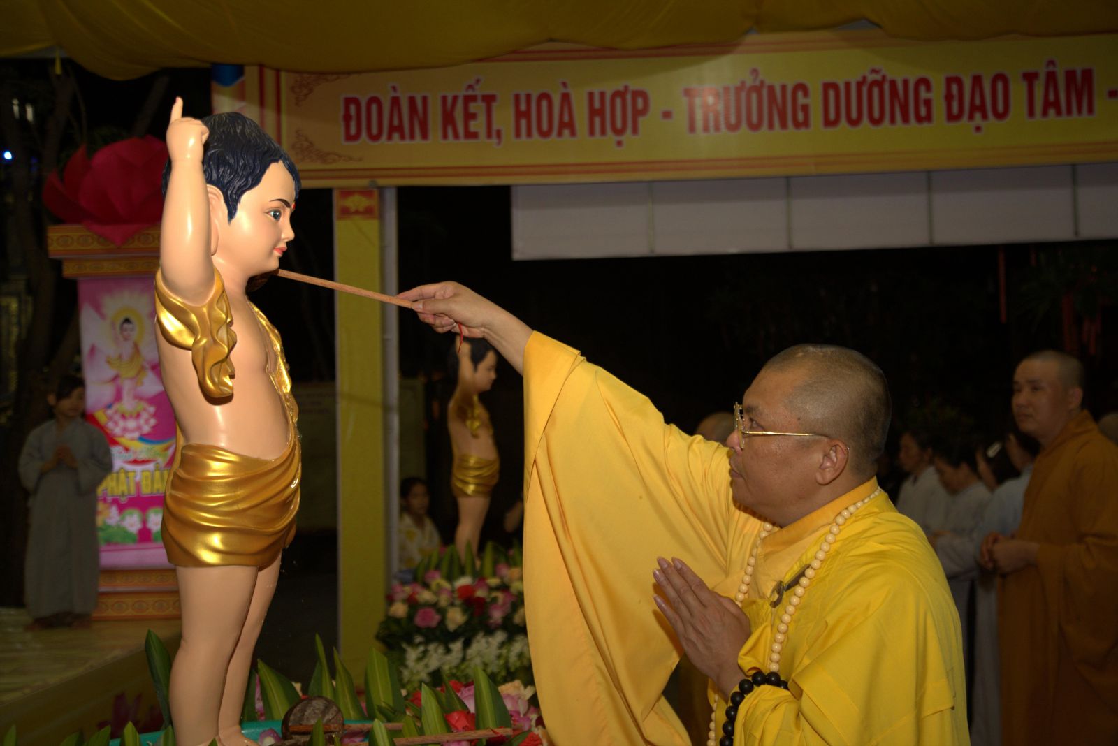 Tại lễ đài, chư tôn đức cử hành nghi thức dâng hương, tụng kinh Khánh đản. Đại chúng lần lượt thực hiện nghi thức tắm Phật truyền thống kính mừng Phật đản trong tiếng niệm danh hiệu hồng danh Đức Từ phụ Thích Ca Mâu Ni Phật.