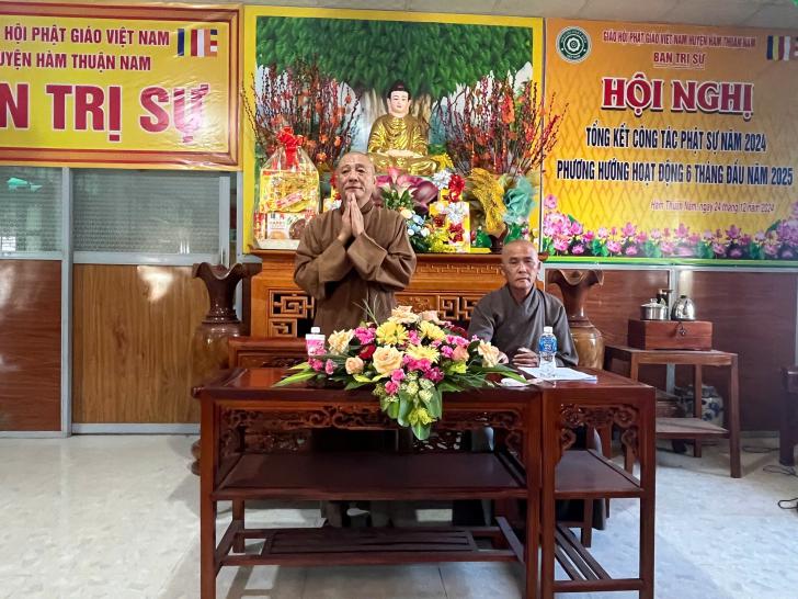 Phát biểu tại buổi lễ, bà Mai Thị Ngọc Ảnh thay mặt chính quyền huyện bày tỏ sự ghi nhận và tri ân đối với những đóng góp tích cực của GHPGVN huyện Hàm Thuận Nam trong công tác Phật sự, giáo dục đạo đức, và các hoạt động an sinh xã hội tại địa phương. Nhân dịp này, lãnh đạo huyện đã tặng lẵng hoa chúc mừng và gửi lời chúc mừng Đại lễ thành công viên mãn.
