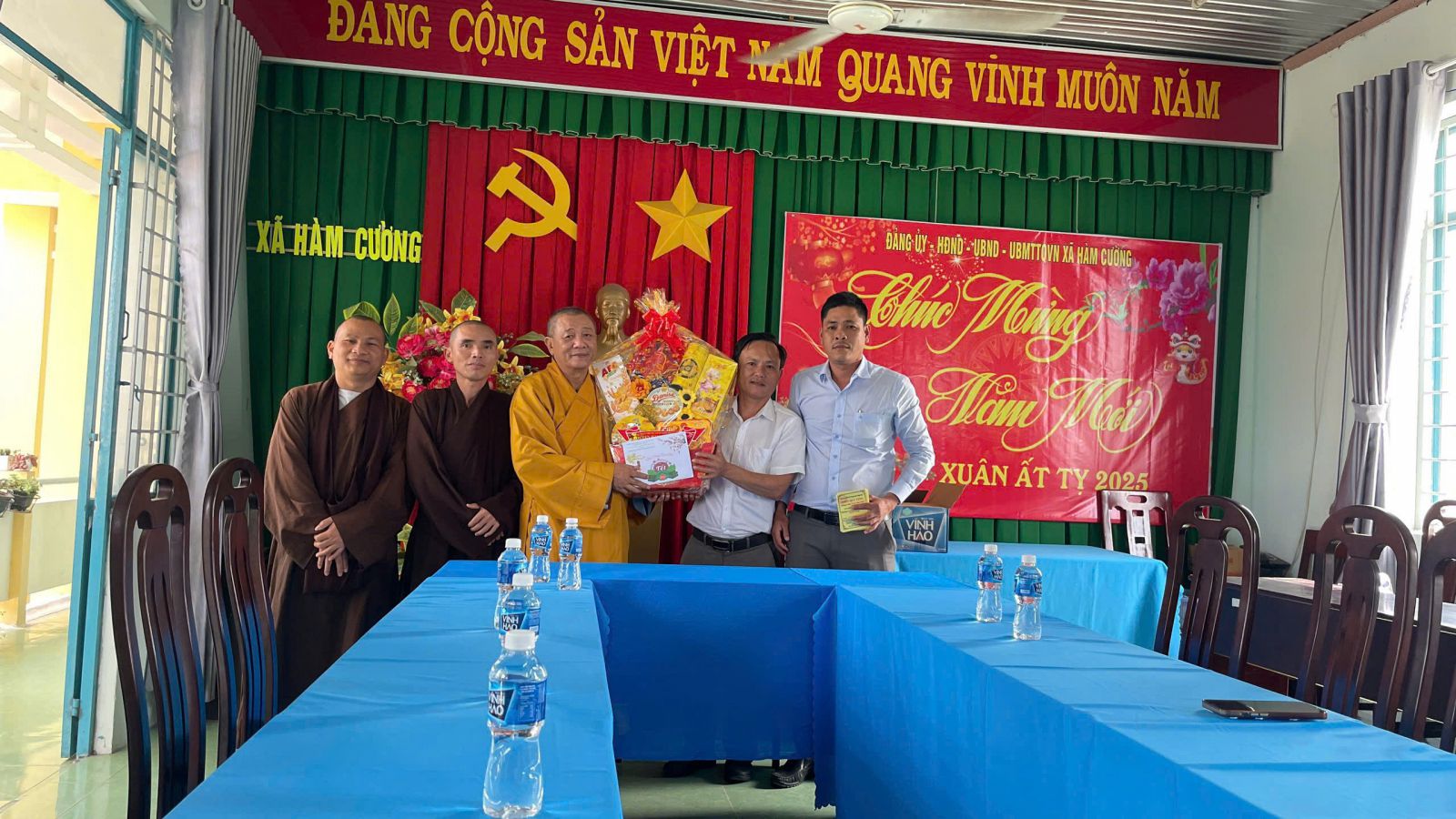 Với sự gắng bó và đồng hành cùng nhau của Đạo pháp và Dân tộc, đoàn đã đến thăm chúc tết Quý Lãnh đạo các ban ngành trong huyện nhà, tiếp đoàn có: ông Võ Hùng Chung, Phó trưởng Ban Dân vận Huyện Uỷ; bà Nguyễn Thị Kim Loan, UV Uỷ Ban kiểm tra Huyện Uỷ; bà Phạm Thị Hà, Chuyên viên Ban Dân vận Huyện Uỷ; bà Cao Thị Tuyết Loan, Chuyên viên Ban Dân vận Huyện Uỷ; bà Thanh Nhã, Phó Chánh văn phòng HĐND - UBND huyện; ông Nguyễn Hữu Khánh, Phó Chủ tịch Thường trực MTTQVN huyện; ông Lê Hoàng Nhã, Trưởng phòng Nội vụ; ông Bùi Thanh Hà, Chuyên viên phòng Nội vụ; ông Hà Văn Hiền - Phó trưởng CA huyện; ông Võ Thanh Nghị - Đội trưởng đội An ninh huyện; ông Nguyễn Minh Thành, Phó chỉ huy trưởng Ban chỉ huy quân sự huyện; ông Nguyễn Minh Quốc, Bí thư xã Hàm Cường.