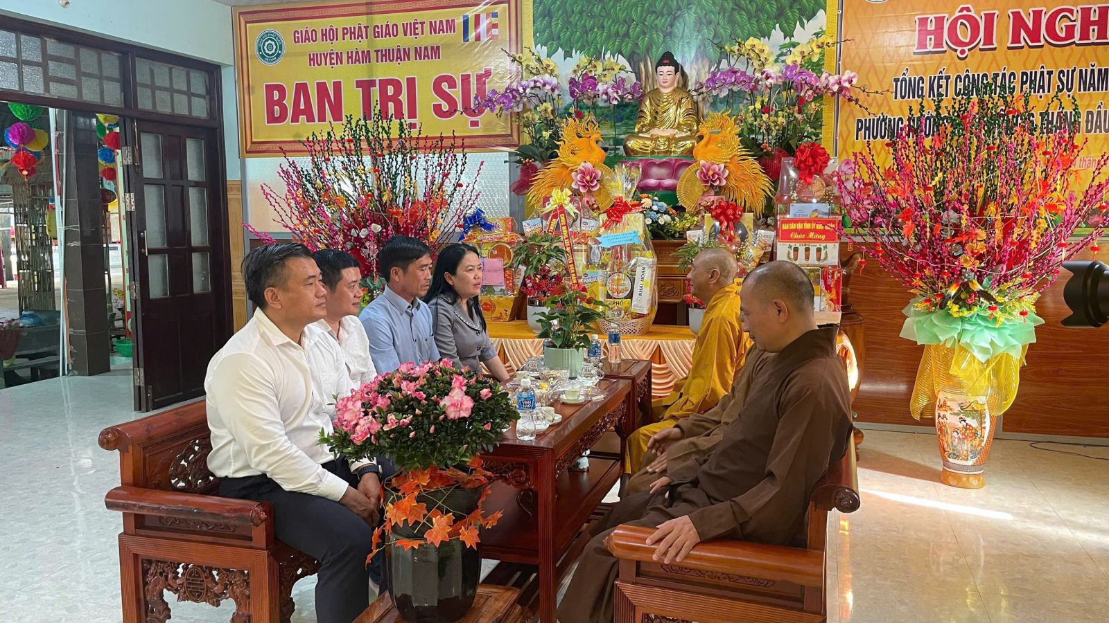 Thường trực BTS ghi nhận và cảm ơn sự quan tâm giúp đỡ của Quý Lãnh đạo các ban ngành, các cấp, tạo duyên lành cho Phật giáo huyện nhà luôn đồng hành cùng Dân tộc, sự gắn kết tốt đẹp giữa đạo và đời. Nhân dịp năm mới, Thường trực Ban trị sự huyện cũng gửi lời kính chúc mừng năm mới an khang, thịnh vượng, tràn đầy sức khoẻ đến lãnh đạo Sở Nội Vụ, Ban Tôn Giáo Tỉnh, UBND huyện Hàm Thuận Nam.