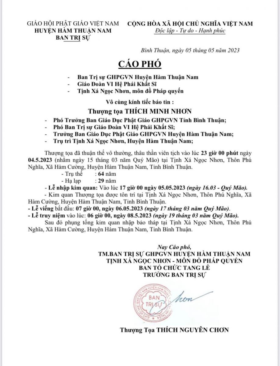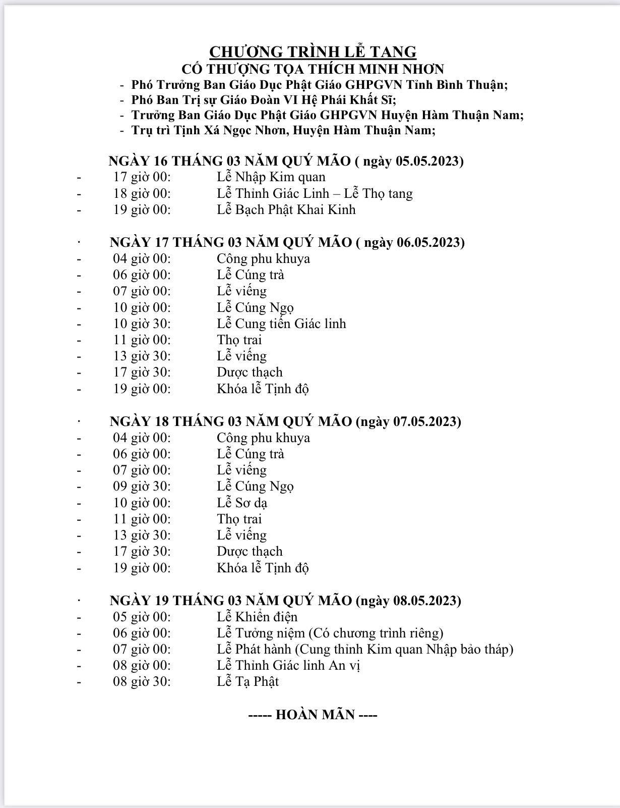Lễ truy niệm vào lúc 6 giờ, ngày 8-5-2023 (19-3-Quý Mão). Sau đó cung tống kim quan nhập bảo tháp tại tịnh xá Ngọc Nhơn (thôn Phú Nghĩa, xã Hàm Cường, H.Hàm Thuận Nam, Bình Thuận).