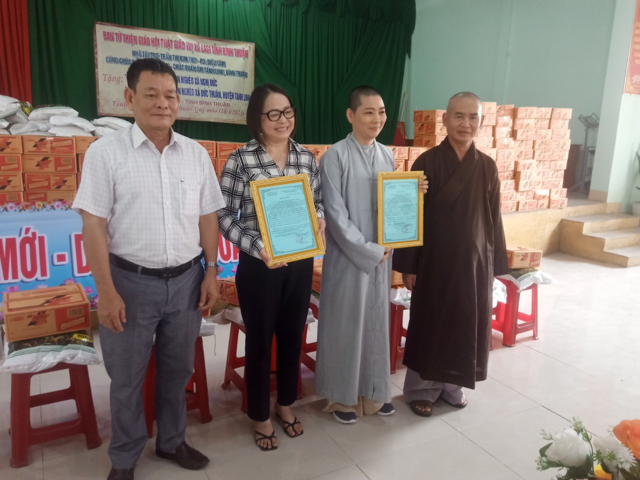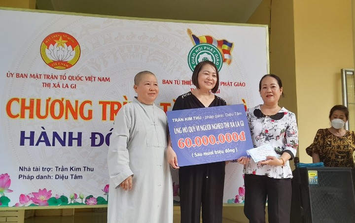 Ngày 17-4 đoàn đoàn đến Uỷ ban MT TQ Việt Nam thị xã La Gi để trao quà, tiếp đoàn là bà Phạm Thị Thương- Chủ tịch Uỷ ban MT TQ Việt Nam thị xã La Gi. Sau khi thăm hỏi, tuyên dương Ni sư TN. Chơn Huy cùng nhà tài trợ, bà Thương đã hướng dẫn mọi người trao quà cho 220 bà con tại đây.