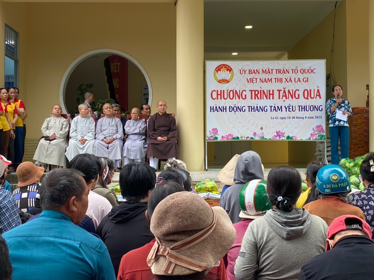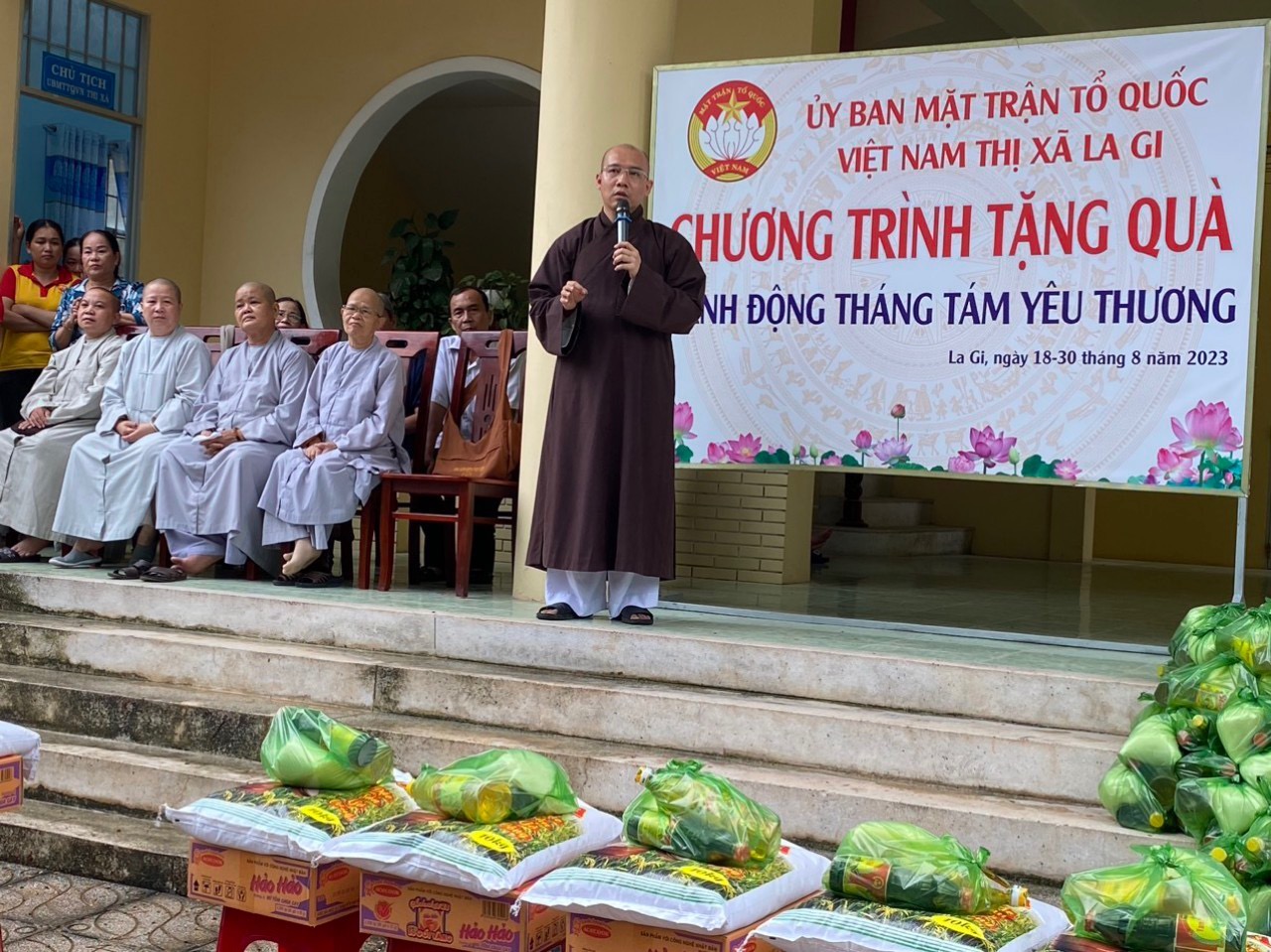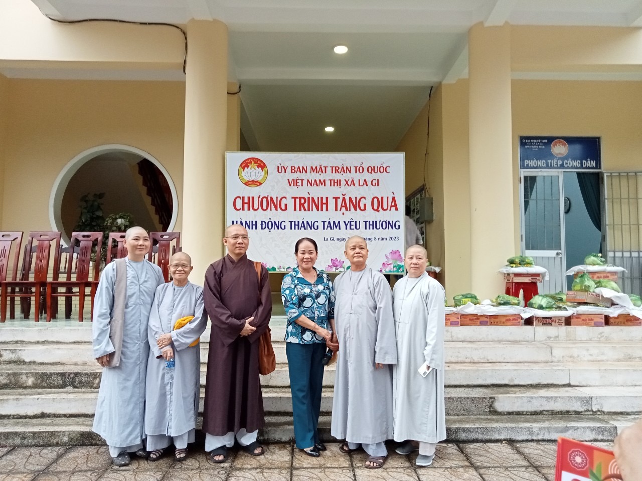 Tham dự lễ phát quà có ĐĐ.Thích Chúc Thạnh- Uỷ viên BTS tỉnh, Phó trưởng Ban kiêm Chánh Thư ký BTS PG Thị xã; Ni sư Thích nữ Hạnh Giải - Phó trưởng Ban Trị sự kiêm Trưởng phân Ban ni giới PG thị xã La Gi; Ni sư Thích nữ Thông Ngộ - Viện chủ tịnh thất Huyền Trang; Ni sư Thích nữ Chơn Huy- Trưởng ban Từ thiện xã hội PG thị xã La Gi cùng chư Tôn đức Ni trong thị xã. Ngoài ra, còn có sự tham dự của Chủ tịch các Hội: Hội Người cao tuổi, Hội Nạn nhân da cam, Hội Bảo trợ người khuyết tật và trẻ mồ côi cùng quý Mạnh Thường Quân tài trợ cho công tác từ thiện này.