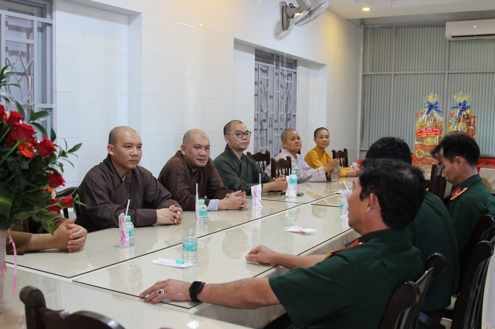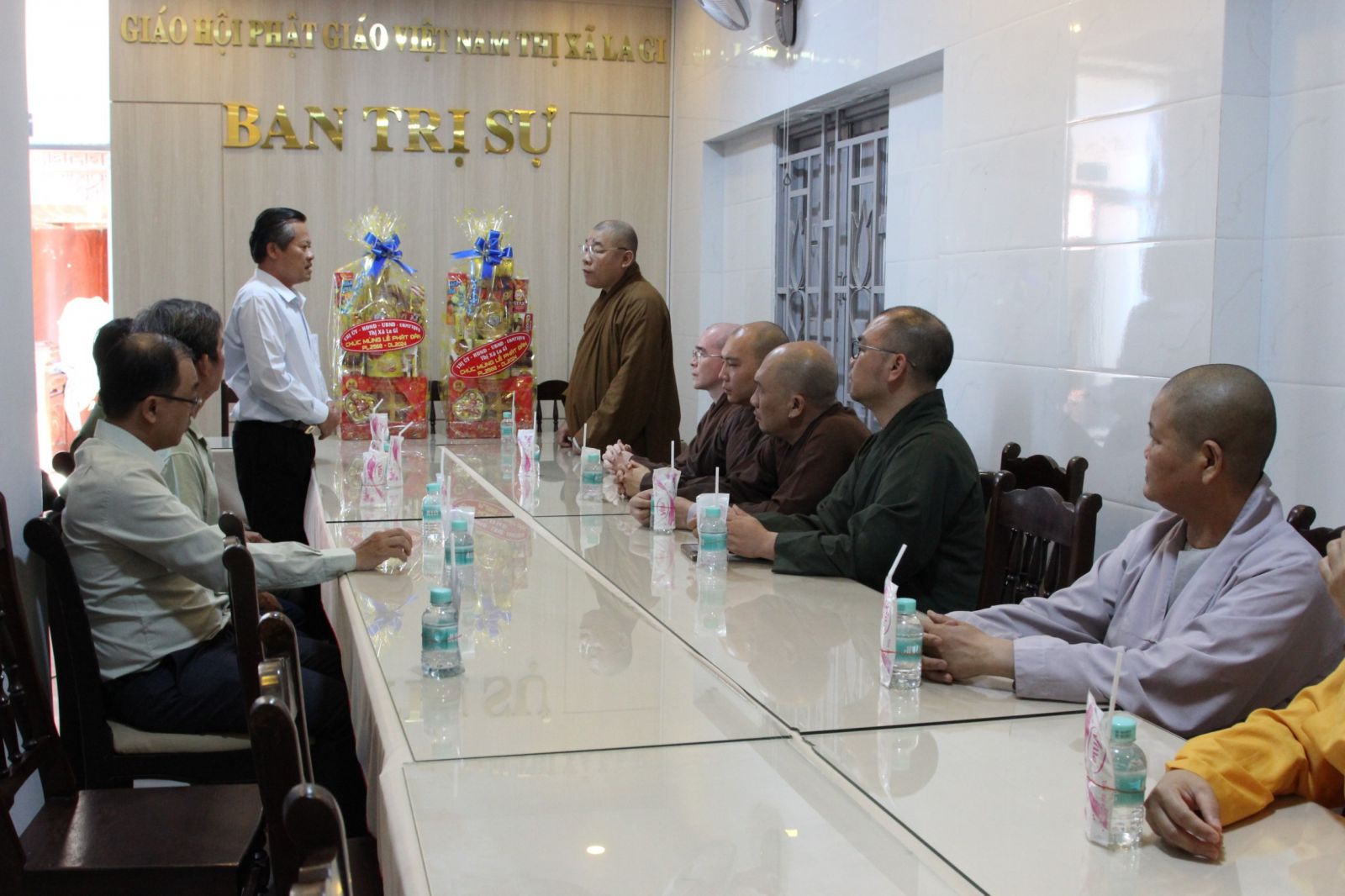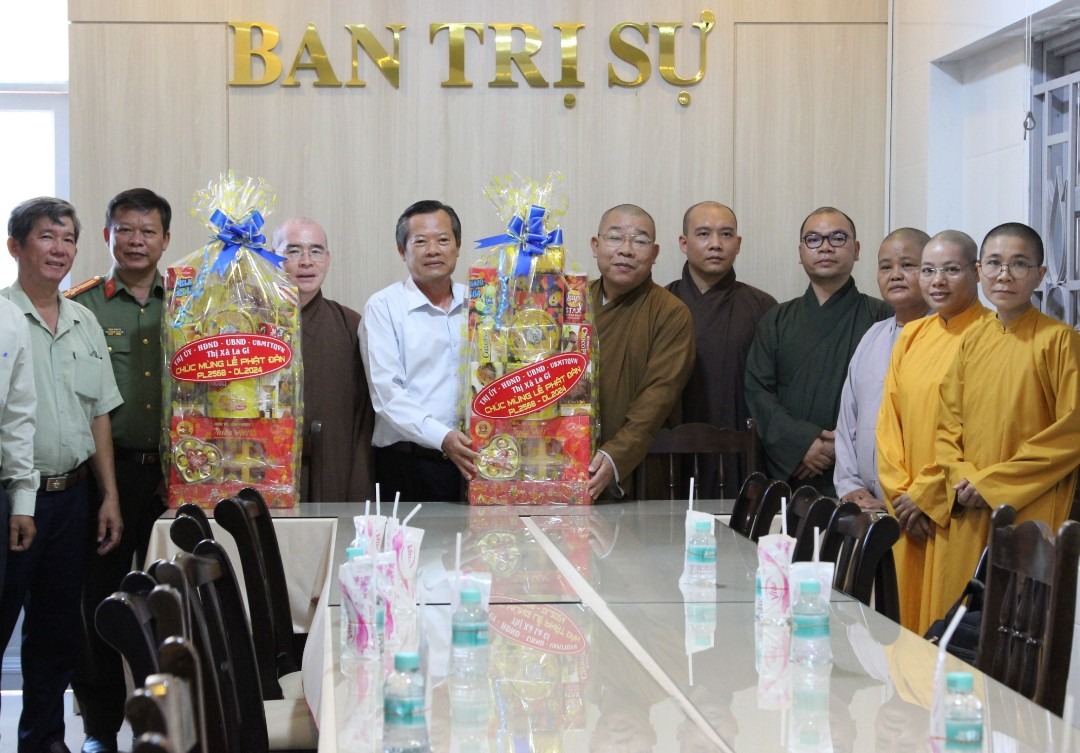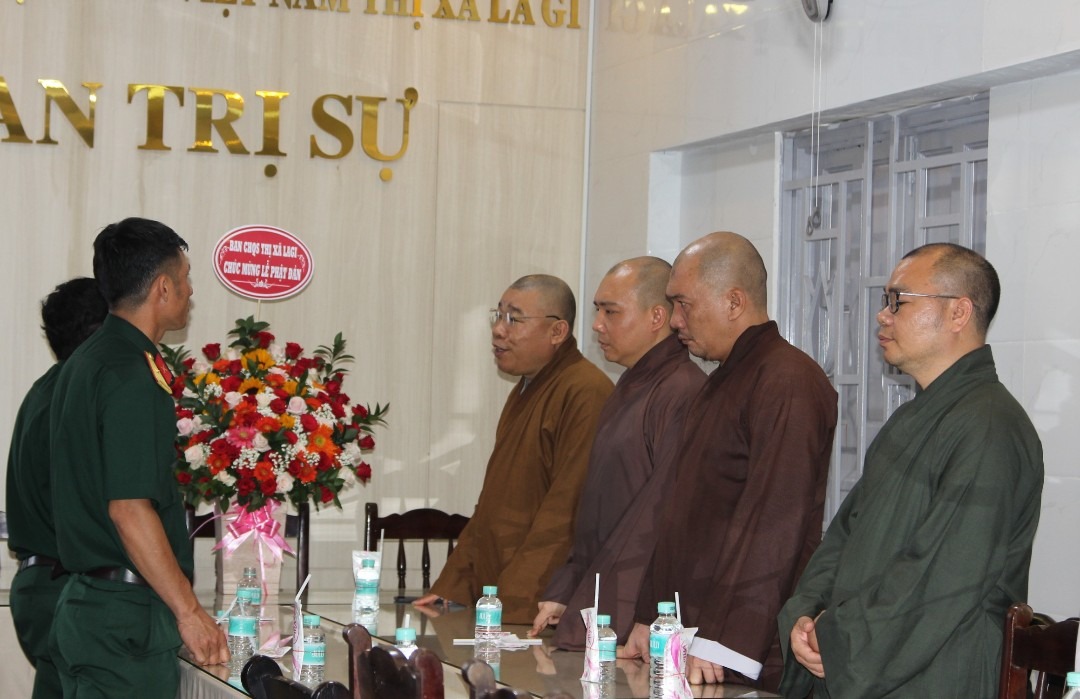 Đại diện đoàn  BTS PG thị xã, TT. Thích Pháp Huệ đã bày tỏ lòng hoan hỷ trước sự quan tâm của chính quyền thị xã, đã đến thăm, chúc mừng Đại lễ Phật đản PL. 2568. Ban Trị sự PG thị xã, chư Tăng Ni, tín đồ Phật tử sẽ tiếp tục đồng hành cùng Chính quyền thị xã trong việc thực hiện các chủ trương; phối hợp, đồng hành cùng UBMTTQ thị xã trong các phong trào an sinh xã hội; phát huy tinh thần đoàn kết Tăng Ni, Phật tử trong việc lợi Đạo, ích đời. Thượng toạ đã cảm ơn, gửi lời chúc sức khoẻ đến Đảng bộ, Chính quyền thị xã La Gi.