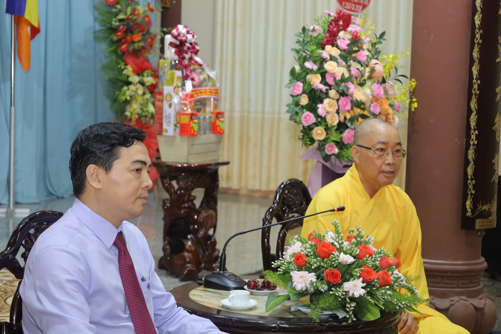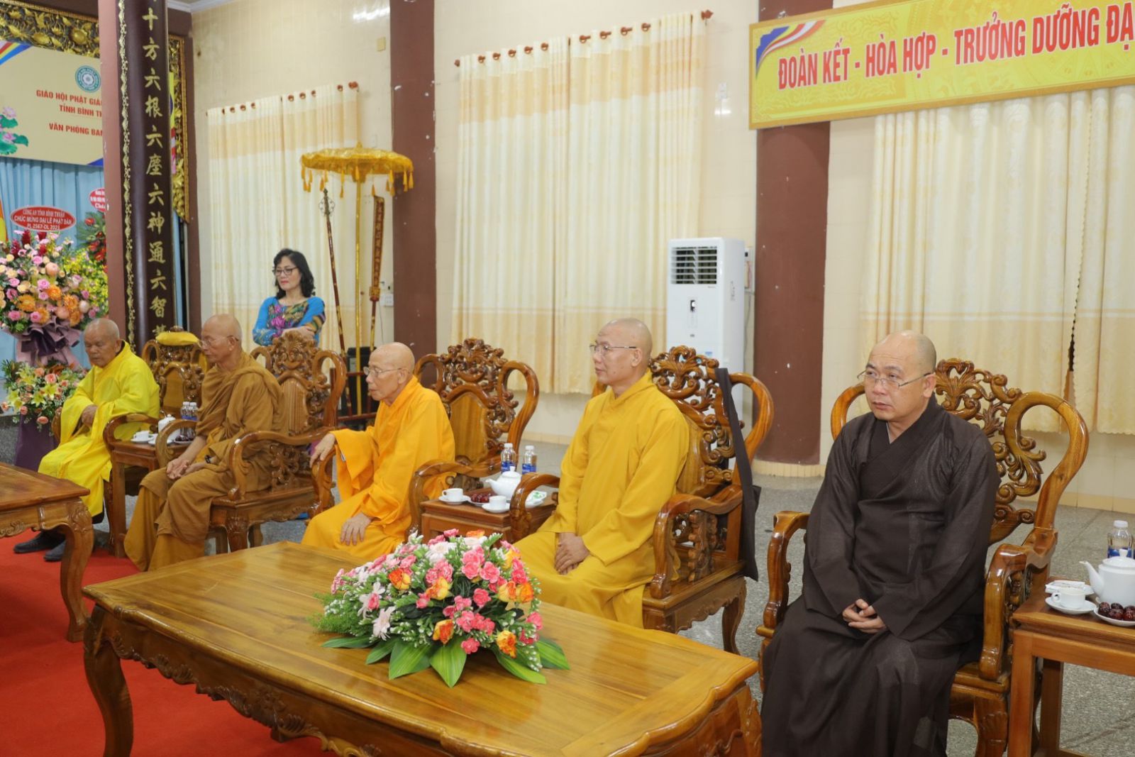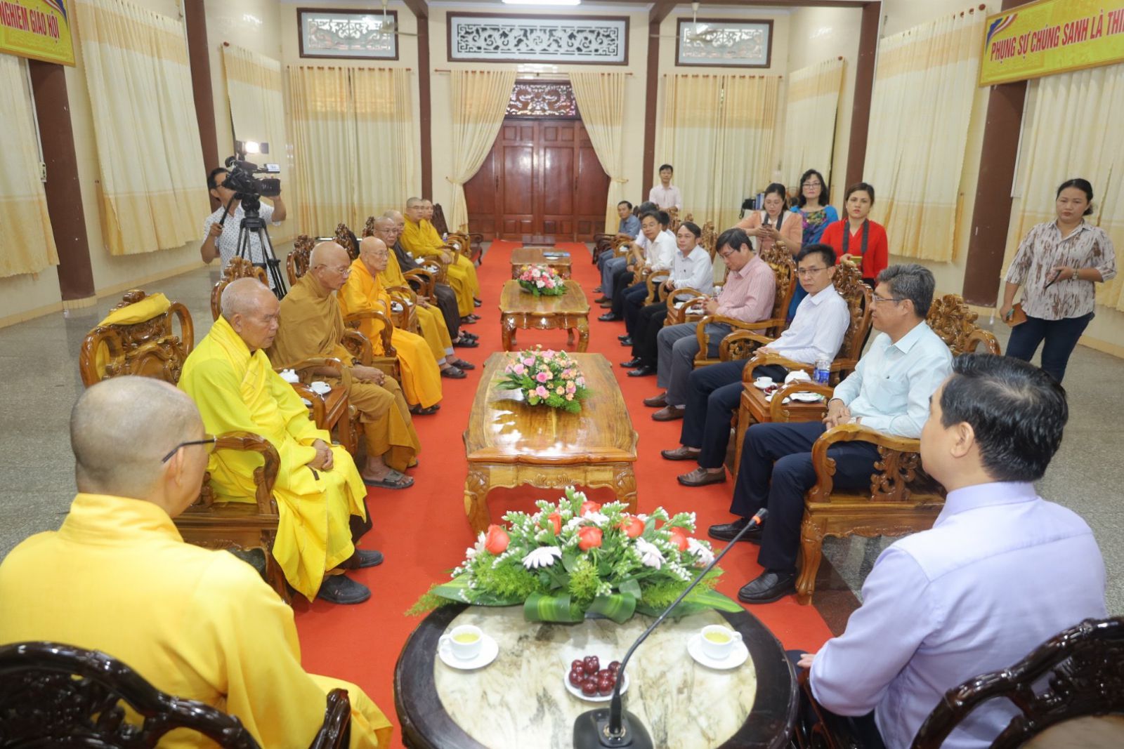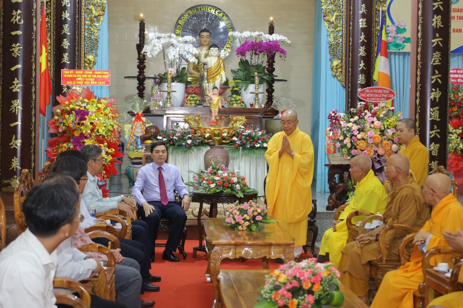 Tiếp đón phái đoàn có sự Quang lâm tham dự của Trưởng lão HT. Thích Giác Minh, Trưởng lão HT. Thích Minh Trí; Trưỡng lão HT. Thích Giác Sơn – đồng Thành viên HĐCM, Chứng minh BTS Phật giáo Tỉnh; HT. Thích Minh Nhật - Uỷ viên HĐTS, Trưởng Ban Trị sự kiêm Trưởng Ban Tăng sự Phật giáo Tỉnh; TT. Thích Thông Triêm - Uỷ viên HĐTS, Phó Trưởng Ban Thường trực kiêm Trưởng Ban GDPG Tỉnh; TT. Thích Nguyên Sắc – Phó Trưởng Ban Trị sự Phật giáo Tỉnh; ĐĐ. Thích Nguyên Nguyệt – Phó Trưởng Ban kiêm Chánh Thư ký BTS Phật giáo Tỉnh; ĐĐ. Thích Quảng Pháp – Phó Thư ký kiêm Chánh Văn phòng Ban Trị sự Phật giáo Tỉnh.