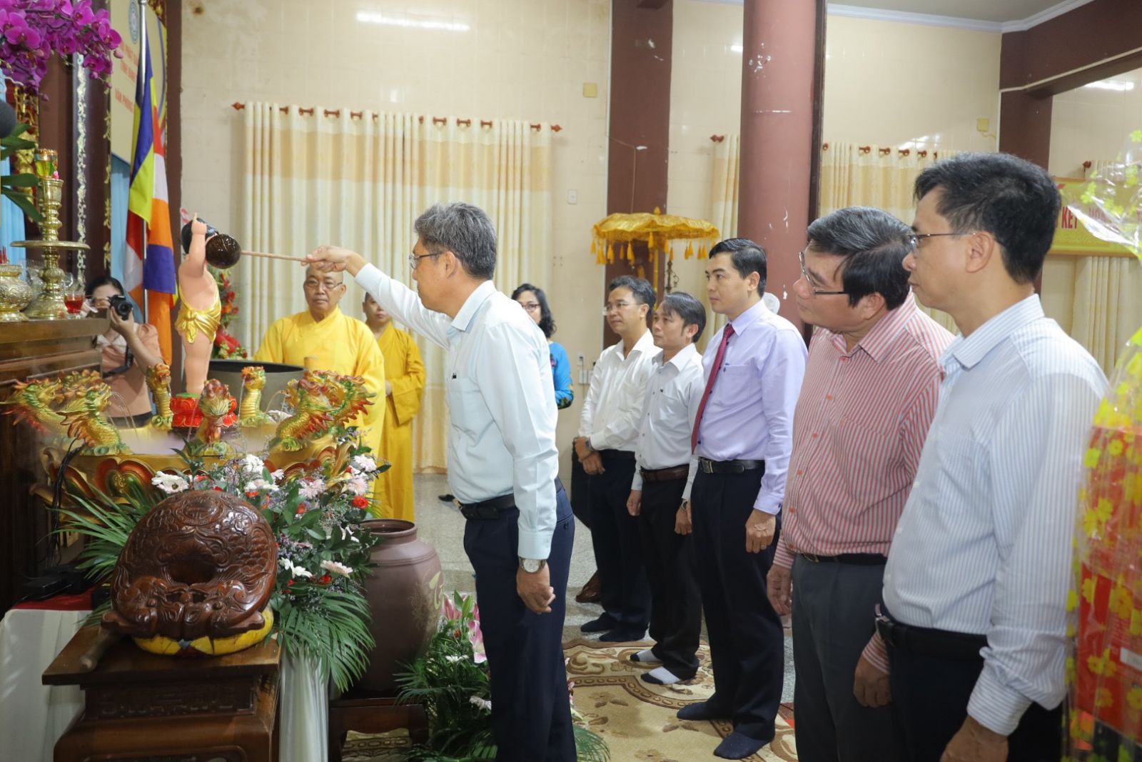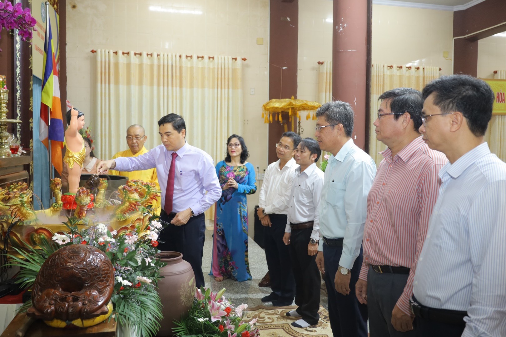 Dịp này, Hòa thượng Trưởng ban Trị sự cũng đã hướng dẫn phái đoàn dâng hương, thực hiện nghi thức tắm Phật tại lễ đài Trụ sở Văn phòng Ban Trị sự.