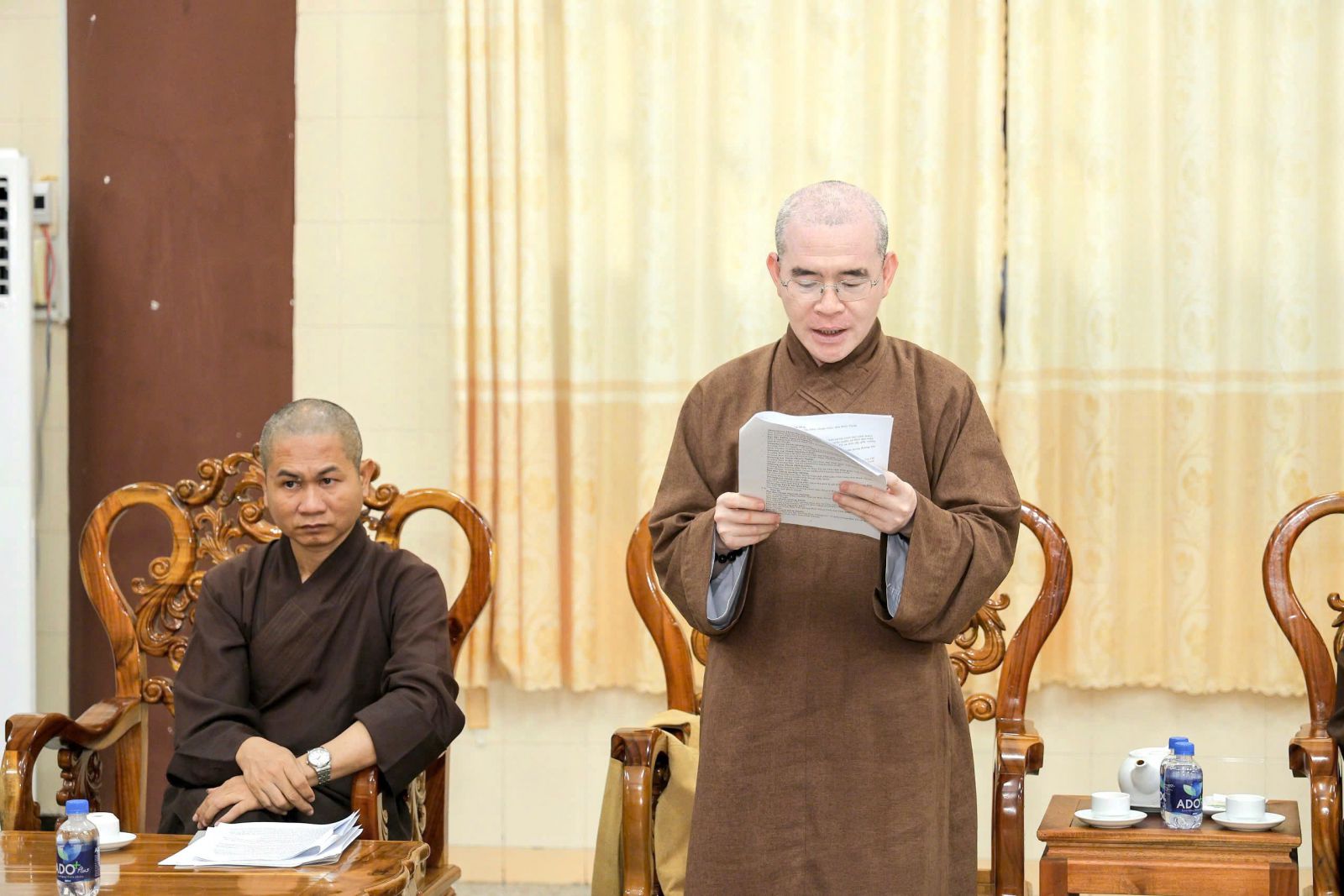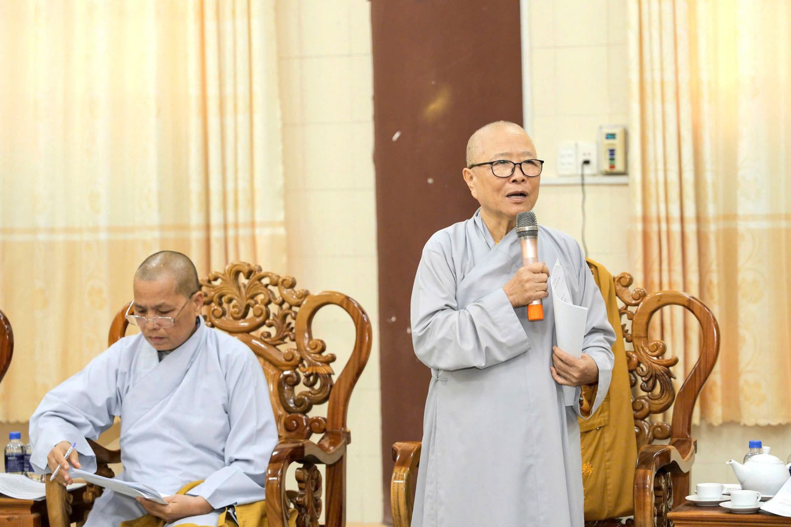 Thay mặt Thư ký Văn phòng BTS, ĐĐ. Thích Quảng Pháp đã trình bày bản Thông báo tổ chức Đại Giới đàn “Chơn Thành” PL. 2569; Triển khai Thông bạch hướng dẫn tổ chức Đại lễ Phật đản Thông bạch An cư kết Hạ PL. 2569 của TWGH; Dự thảo kế hoạch tổ chức Đại lễ Phật đản Vesak PL. 2569 – DL. 2025 của BTS Tỉnh.