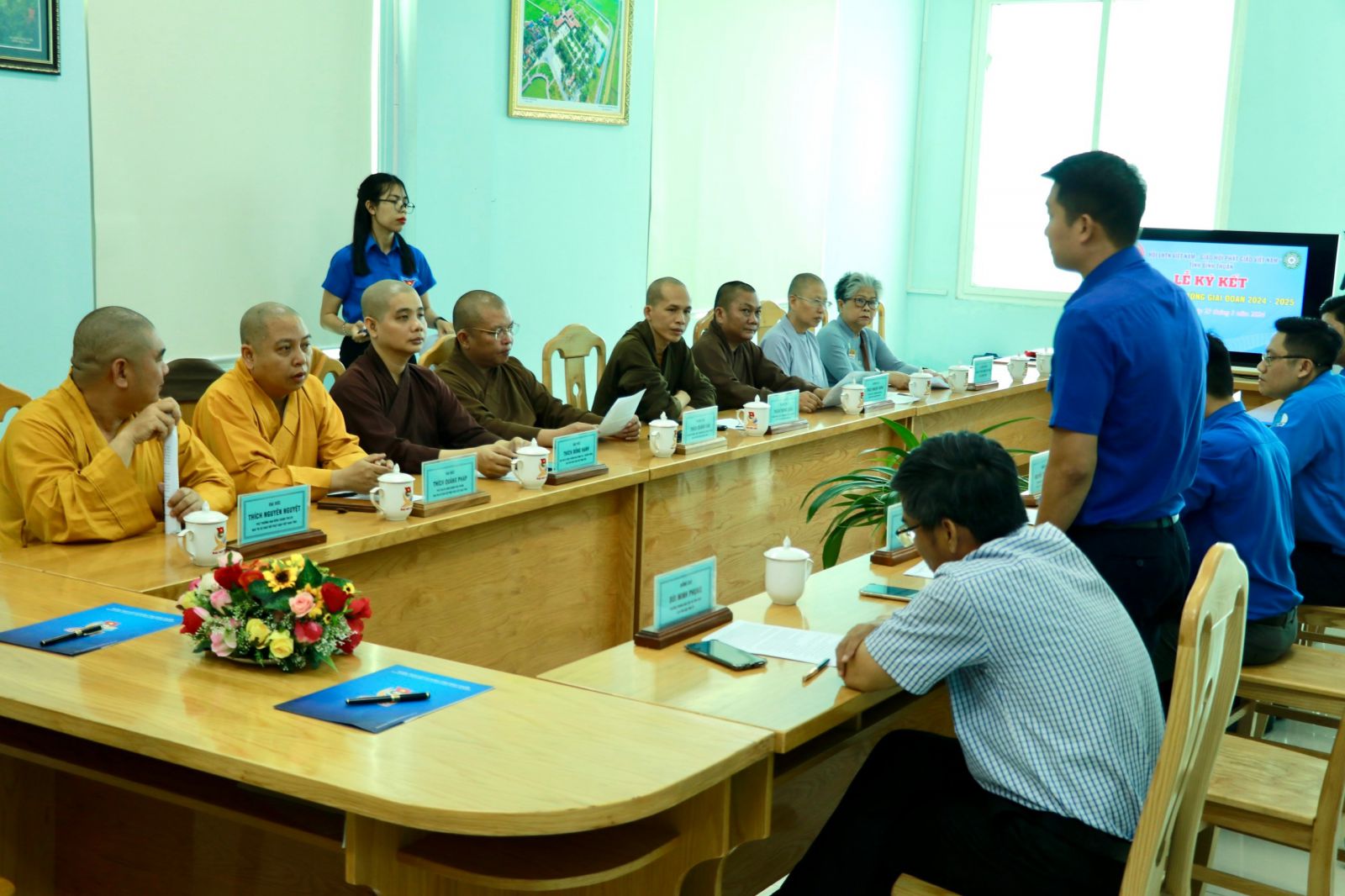 Tại buổi lễ, ĐĐ. Thích Nguyên Nguyệt đại diện Ban Trị sự GHPGVN tỉnh và ông Thái Thành Bi đại diện Hội Liên hiệp Thanh niên VN tỉnh đã ký kết chương trình phối hợp hợp giai đoạn 2024 -2025.