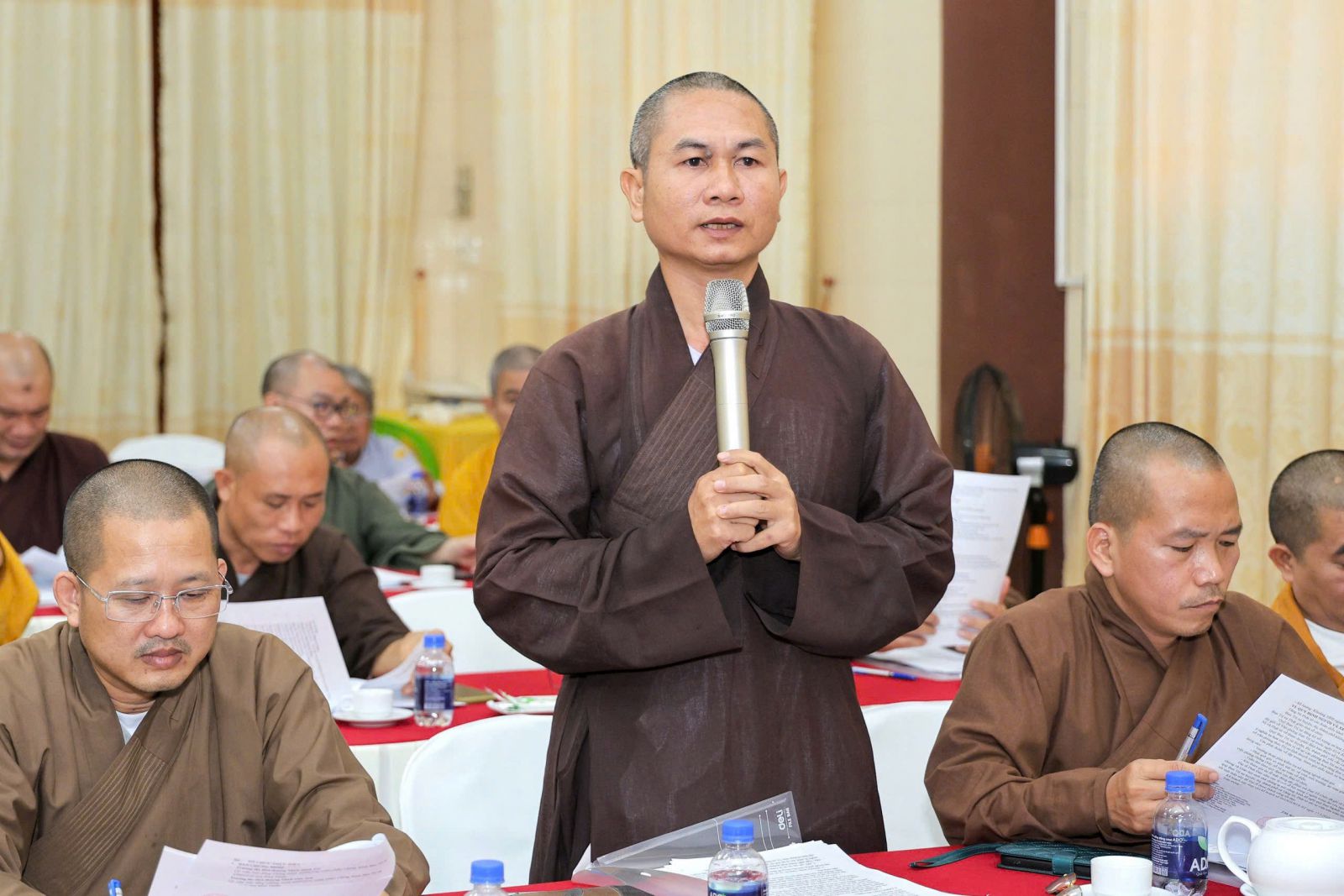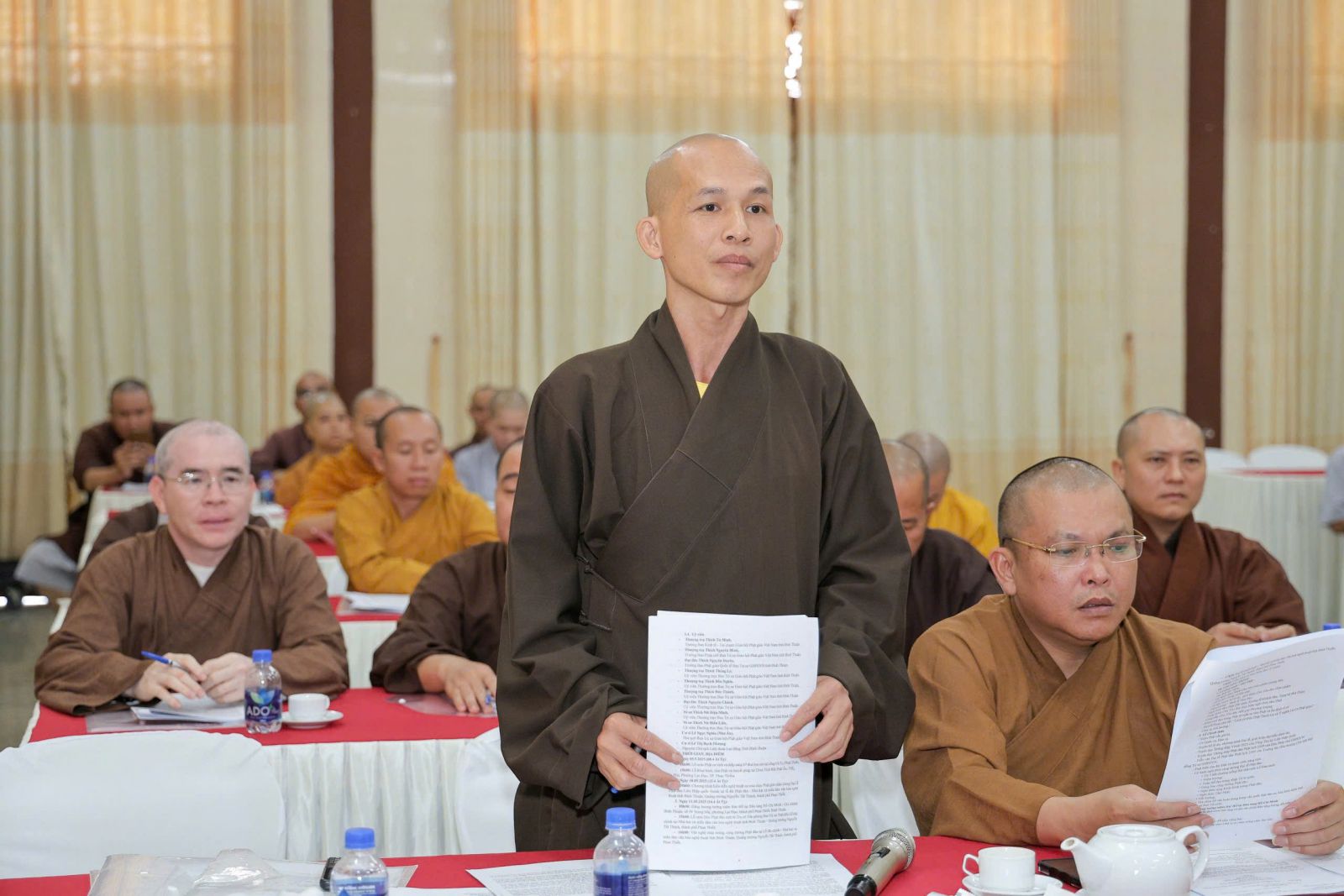 Thay mặt Ban Thư ký, Đại đức Thích Quảng Pháp – Phó Thư ký kiêm Chánh Văn phòng BTS đã trình bày: Danh sách Ban Tổ chức, các Tiểu Ban Đại lễ Phật đản cấp tỉnh; công tác thiết trí, lễ thắp sáng 7 đoá hoa sen trên sông Cà Ty; lễ cung rước Tôn tượng Đản sanh từ trụ sở Văn phòng Ban Trị sự đến địa điểm thắp sáng hoa sen; các hoạt động ý nghĩa khác trong khuôn khổ tuần lễ kính mừng Đại lễ Phật đản PL. 2569 .