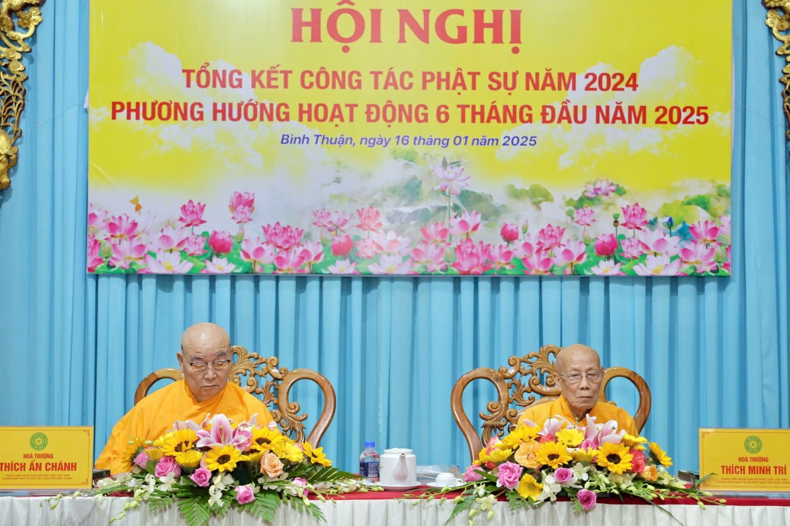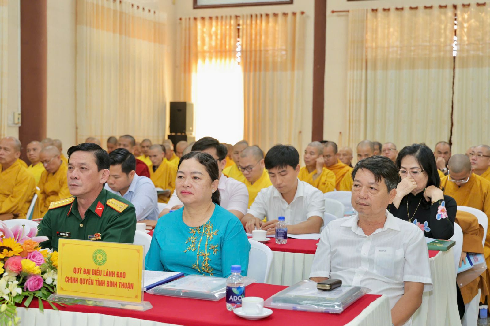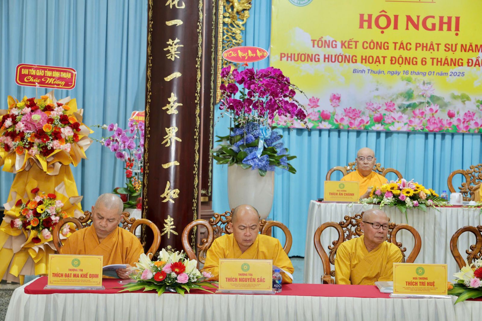 Chủ tọa Hội nghị có Hòa thượng Thích Minh Nhật – Ủy viên HĐTS, Trưởng BTS kiêm Trưởng Ban Tăng sự GHPGVN tỉnh Bình Thuận; Thượng tọa Thích Thông Triêm – Ủy viên HĐTS, Phó trưởng Ban Thường trực BTS kiêm Trưởng Ban GDPG GHPGVN tỉnh; Hòa thượng Thích Trí Huệ - Phó Trưởng Ban Trị sự GHPGVN tỉnh; Thượng tọa Thích Pháp Huệ - Phó Trưởng BTS kiêm Trưởng Ban Hoằng pháp GHPGVN tỉnh; Thượng tọa Thích Đạt Ma Khế Định, Thượng tọa Thích Nguyên Sắc – Phó Trưởng Ban Trị sự Phật giáo tỉnh; ĐĐ. Thích Nguyên Nguyệt – Phó Trưởng Ban kiêm Chánh Thư ký BTS GHPGVN tỉnh; ĐĐ. Thích Quảng Pháp phó Thư ký, Chánh Văn phòng BTS GHPGVN tỉnh; Chư Tôn đức Thường trực Ban Trị sự Phật giáo tỉnh. Đại diện Phân Ban Ni giới có Ni trưởng Thích Nữ Như Hải – UVTT BTS, Trưởng Phân Ban Ni giới Tỉnh; cùng chư Tôn đức Tăng, Ni BTS GHPGVN tỉnh; chư Tôn đức Thường trực BTS Phật giáo 10 huyện, thị, thành phố các ban ngành chuyên môn trong tỉnh đồng tham dự.