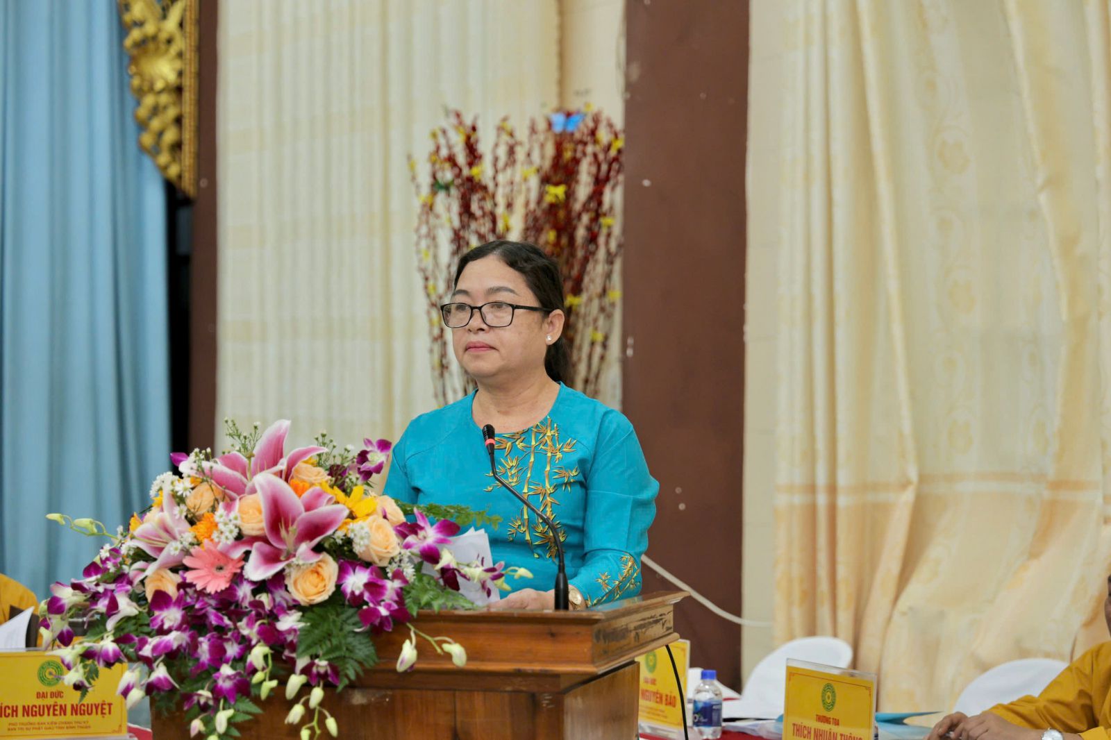 Đại diện chính quyền bà Trần Thị Thanh Hương phát biểu chúc mừng những thành tựu trong công tác Phật sự của GHPGVN tỉnh trong năm qua. Lãnh đạo Tỉnh bày tỏ mong muốn BTS tỉnh tiếp tục vận động Tăng Ni, Phật tử chấp hành chính sách, tiếp tục thực hiện các công tác từ thiện – thiện nguyện, an sinh xã hội, phát huy bảo vệ môi trường, chung tay xây dựng khối đoàn kết xã hội, sống tốt đời đẹp Đạo theo đúng chủ trương Đạo pháp đồng hành cùng dân tộc.