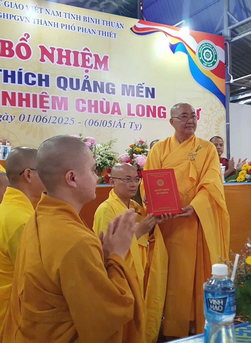 Tại buổi lễ, Đại đức Thích Nguyên Nguyệt – Phó Ban kiêm Chánh Thư ký Ban Trị sự GHPGVN tỉnh Bình Thuận – đã công bố Quyết định bổ nhiệm Đại đức Thích Quảng Mến (thế danh Huỳnh Văn Thương, sinh năm 1990) làm trụ trì chùa Long Ngự (Chùa Bảy Đầu Rồng), phường Đức Long, TP. Phan Thiết.