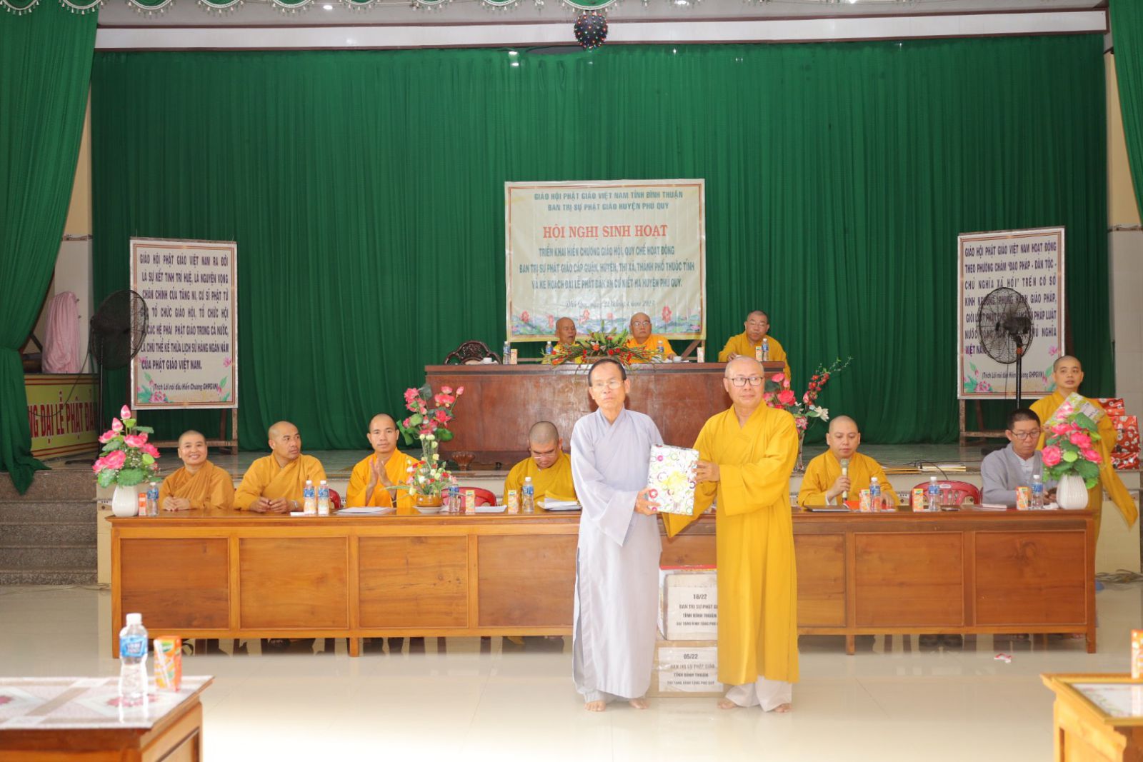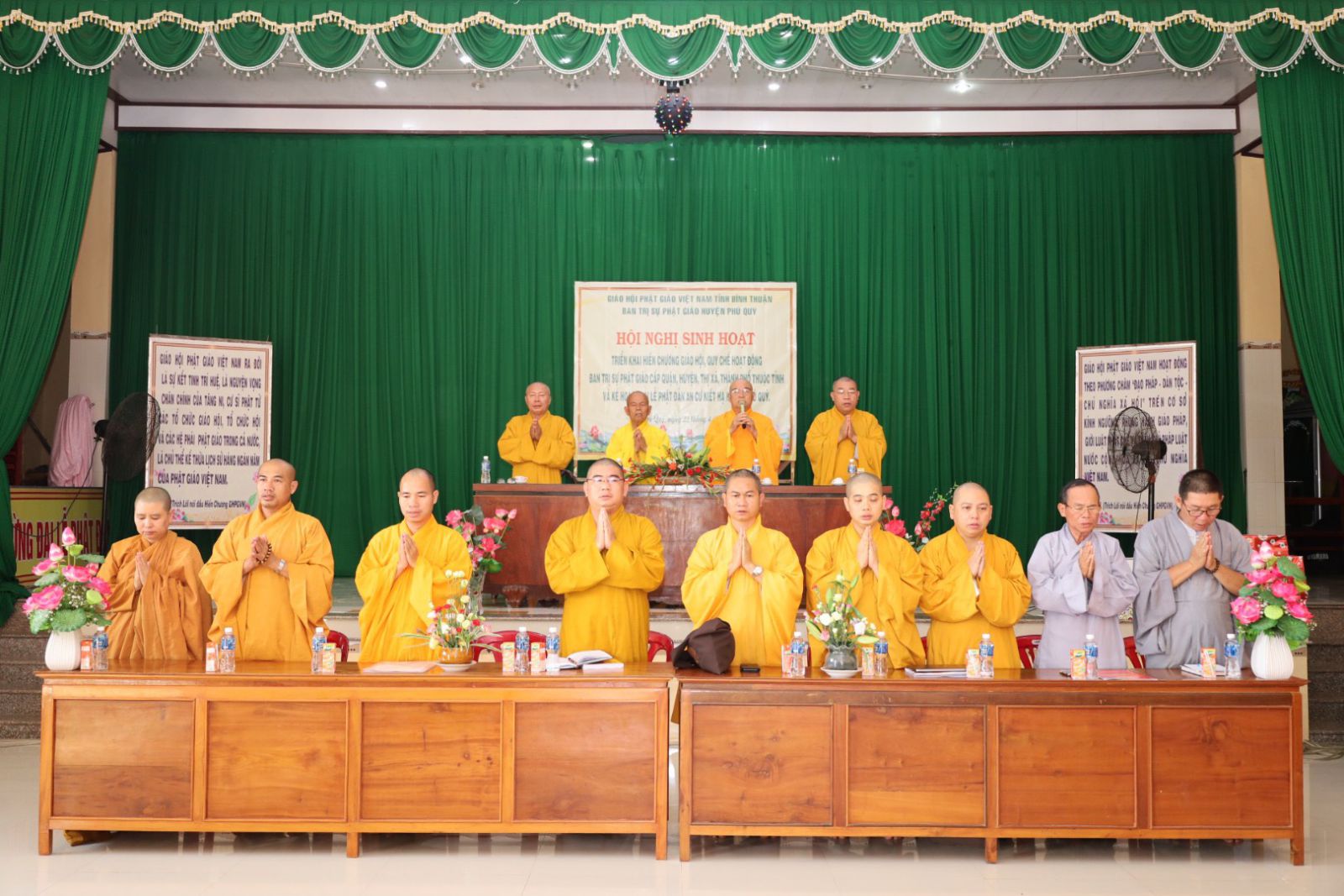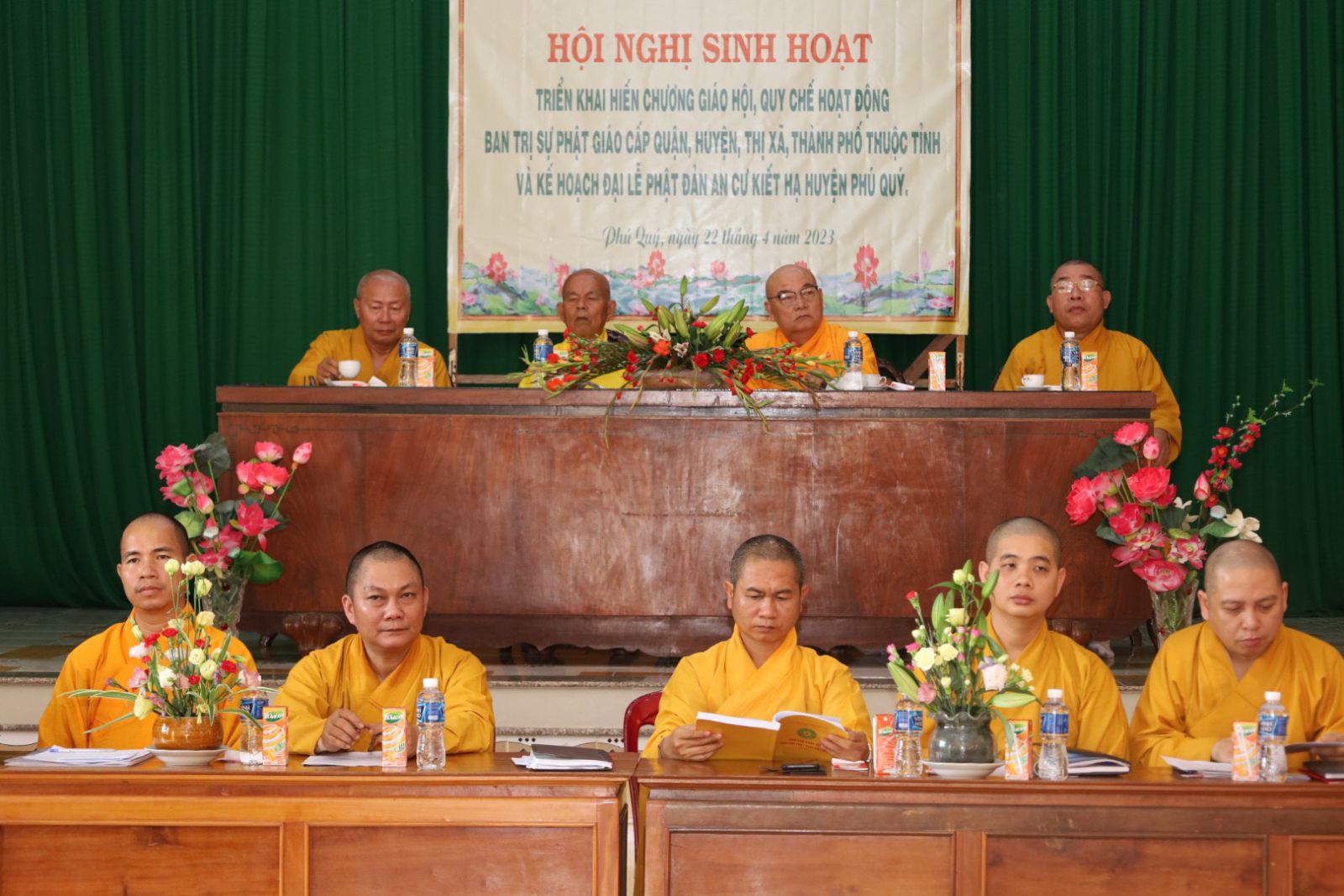 Chứng minh hội nghị có HT. Thích Giác Minh, HT. Thích Ấn Chánh – đồng Thành viên HĐCM, Chứng minh GHPGVN Tỉnh Bình Thuận; HT. Thích Trí Huệ - Phó Trưởng Ban Trị Phật giáo Tỉnh phụ trách Huyện Phú Quý; TT. Thích Pháp Huệ - Phó Trưởng Ban Trị sự kiêm Trưởng Ban Hoằng pháp PG Tỉnh. Chủ toạ hội có ĐĐ. Thích Nguyên Nguyệt – Phó Trưởng Ban kiêm Chánh Thư ký BTS Phật giáo Tỉnh; ĐĐ. Thích Quảng Pháp – Phó Thư ký kiêm Chánh Văn phòng BTS PG Tỉnh; TT. Thích Nhuận Thông – UVTT BTS, Trưởng Ban Văn hoá Phật giáo Tỉnh; TT. Thích Bổn Nghĩa – Uỷ viên Thường Trực BTS PG Tỉnh, Chư Tôn đức Văn phòng BTS PG Tỉnh. Hội nghị còn có sự tham dự của Chư Tôn đức Ban Hoằng pháp, Ban TTTT. Về phía BTS PG Huyện, tham dự hội nghị có cư sĩ Quảng Cao (Nguyễn Đĩnh) – UV BTS Phật giáo Tỉnh, Trưởng Ban Trị sự PG Huyện Phú Quý; cư sĩ Pháp Huệ (Tạ Văn Niêm) – Phó Trưởng Ban TT BTS Phật giáo Huyện Phú Quý; cùng Chư vị thành viên BTS PG Huyện; Đại diện Ban Hộ tự 7 ngôi chùa trên huyện đảo đồng tham dự.