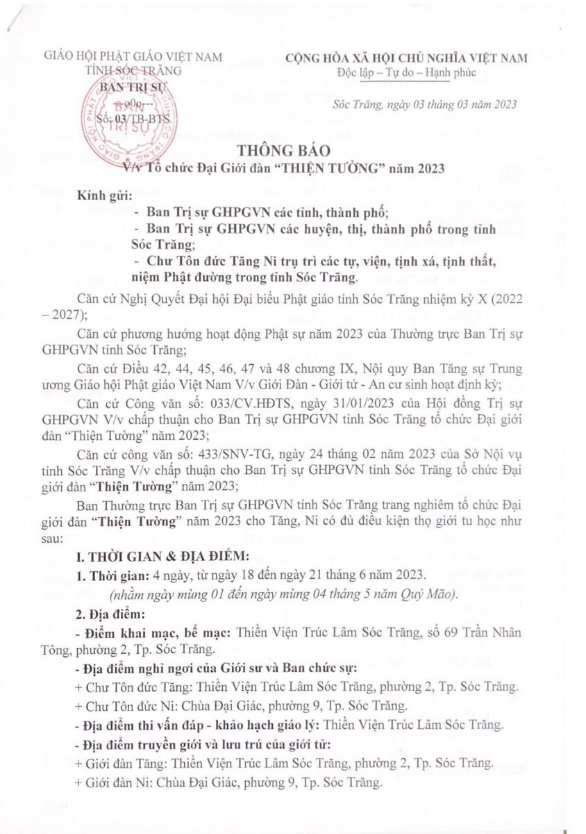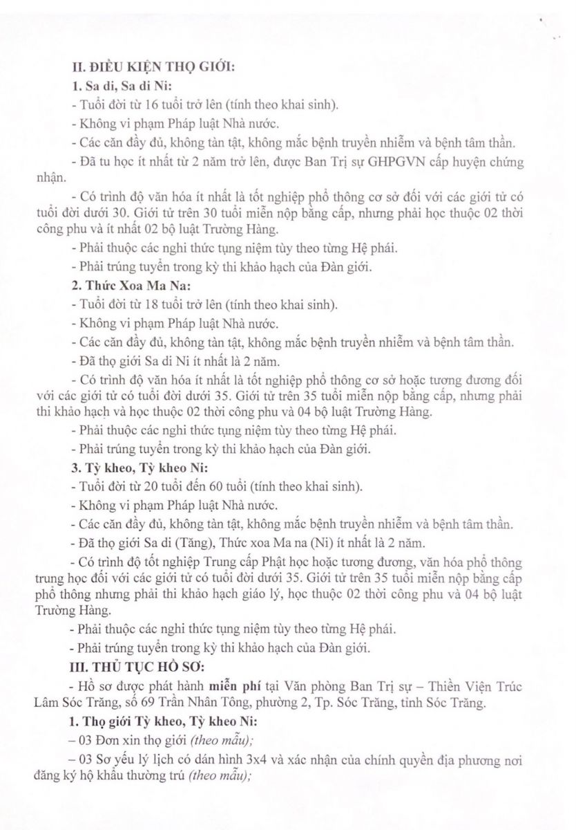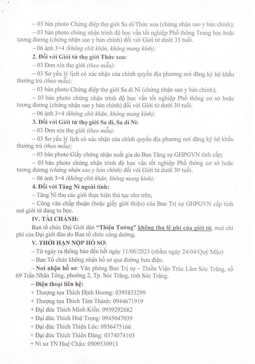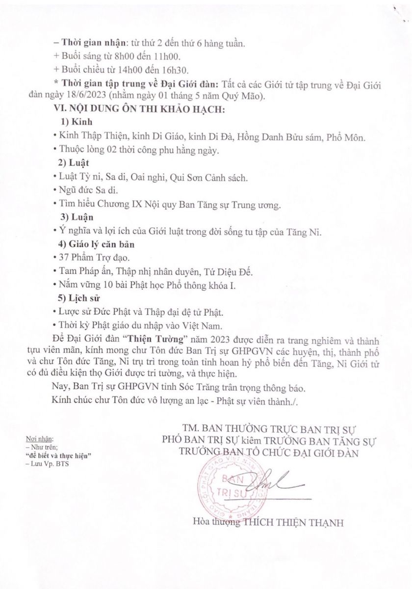 Ban Thường trực Ban Trị sự GHPGVN tỉnh Sóc Trăng trang nghiêm tổ chức Đại giới đàn “Thiện Tường” năm 2023 cho Tăng, Ni có đủ điều kiện thọ giới tu học như sau: