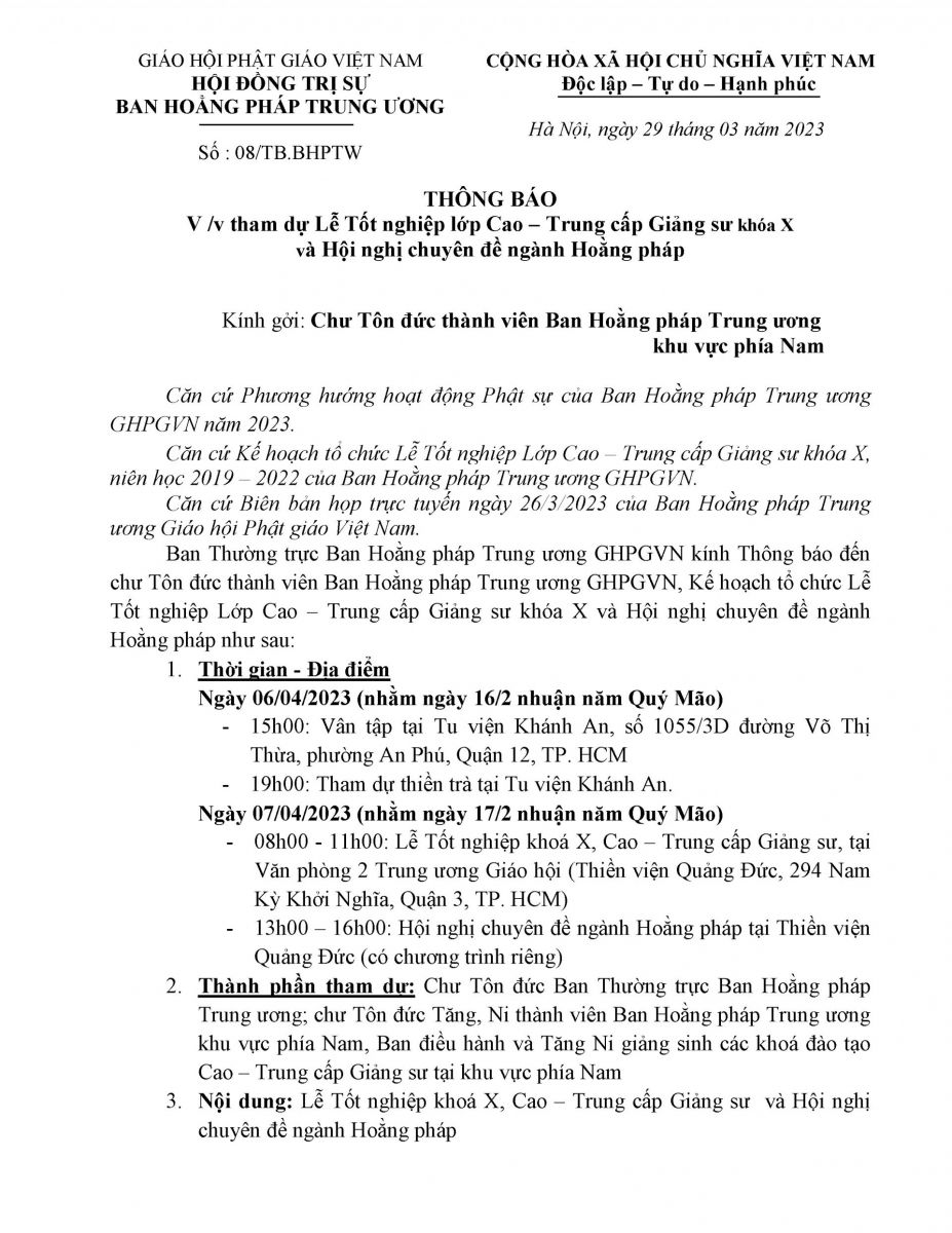 Ban Thường trực Ban Hoằng pháp Trung ương GHPGVN kính Thông báo đến chư Tôn đức thành viên Ban Hoằng pháp Trung ương GHPGVN, Kế hoạch tổ chức Lễ Tốt nghiệp Lớp Cao – Trung cấp Giảng sư khóa X và Hội nghị chuyên đề ngành Hoằng pháp như sau: