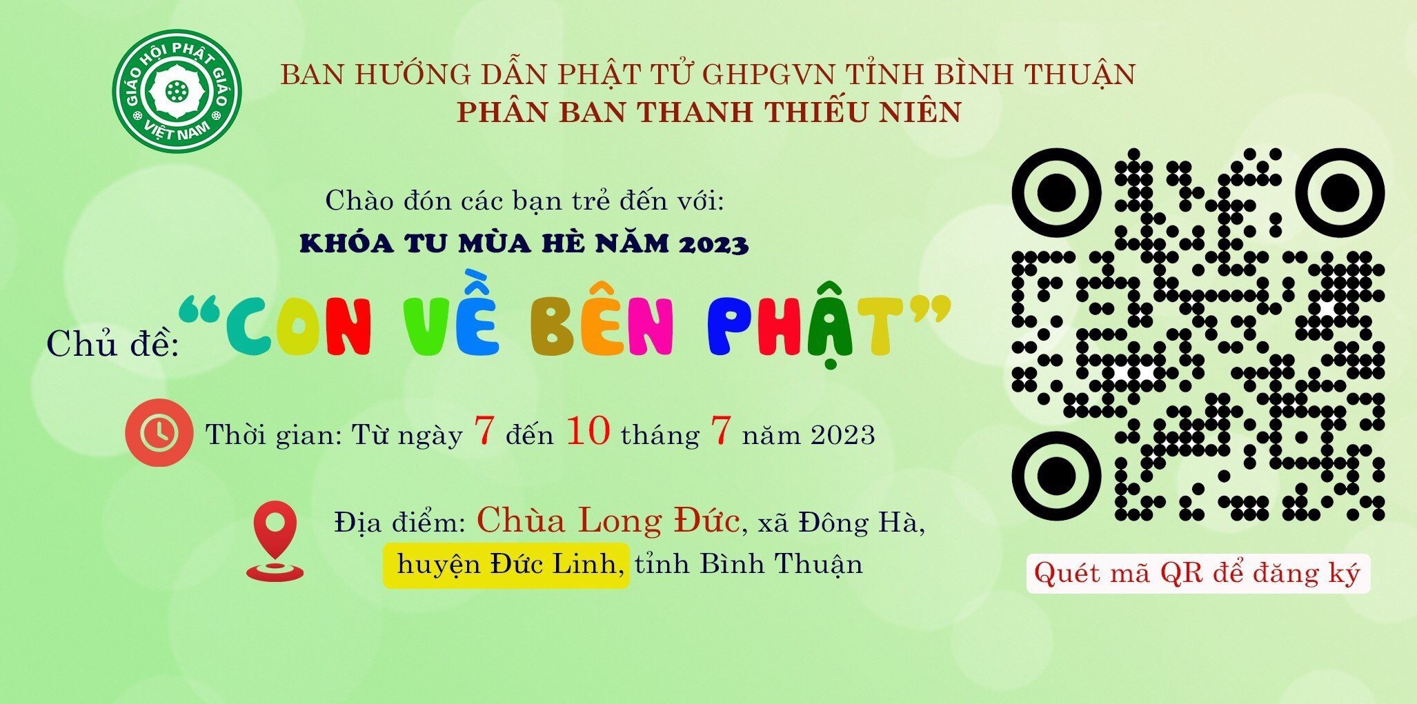 Đăng online theo link (vui lòng scan trên poster) đăng ký hoặc trực tiếp tại điểm tổ chức: Chùa Long Đức, xã Đông Hà, huyện Đức Linh, Tỉnh Bình Thuận bắt đầu từ có thông báo đến 01-07-2023 (khi BTC nhận đủ hồ sơ sẽ dừng đăng ký).
