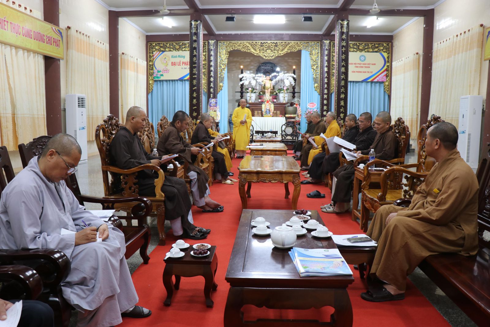 Sau khi lắng nghe báo cáo của Ban Thư ký, Hòa thượng Trưởng Ban Trị sự đã có những chỉ đạo cụ thể từng tiểu ban cũng như nhắc nhở các tiểu ban phối hợp một cách đồng bộ, có hiệu quả, hạn chế thấp nhất những sơ suất không đáng có trong suốt quá trình diễn ra đại lễ. Hòa thượng cũng kêu gọi các Ban Trị sự cấp Huyện, các Ban chuyên môn tập trung tổ chức thành công đại lễ Phật đản cấp huyện, đồng thời chung tay cùng Ban Trị sự Tỉnh trong việc tổ chức Tuần lễ Phật đản năm nay. Hoà thượng chỉ đạo cho Tiểu ban xe hoa – lễ đài trực tiếp thực hiện việc thiết kế lộ trình di chuyển, đảm bảo an ninh trật tự. Đối với những tiểu ban hiện chưa có báo cáo cụ thể về việc triển khai nhiệm vụ, Hòa thượng chỉ đạo các tiểu ban nhanh chóng họp với Ban Thư ký báo cáo để Thường trực Ban Trị sự được nắm bắt kịp thời.