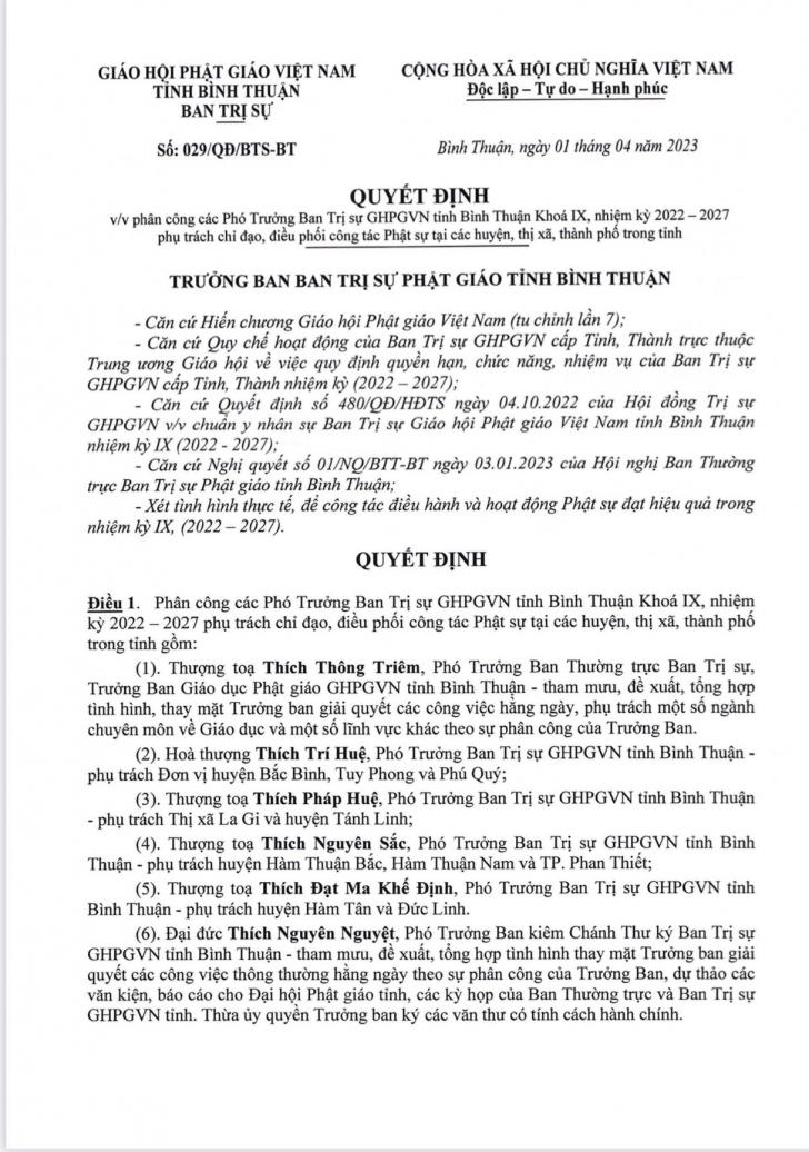 Công văn số 29/QĐ/BTS-BT do Hoà thượng Thích Minh Nhật - Trưởng Ban Trị sự GHPGVN tỉnh ấn ký ngày 1/04/2023 về ...