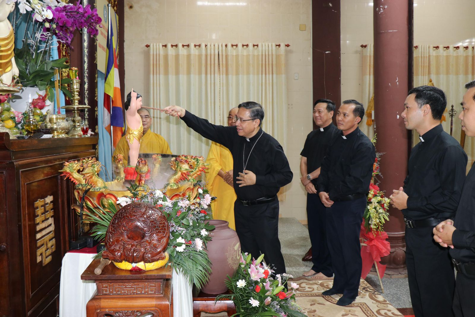 Dịp này, Hòa thượng Trưởng ban Trị sự GHPGVN TP.HCM hướng dẫn ngài Tổng Giám mục Tổng Giáo phận TP.HCM cùng thành viên đoàn dâng hương và thực hiện nghi thức tắm Phật tại lễ đài Văn phòng Ban Trị sự Tỉnh.