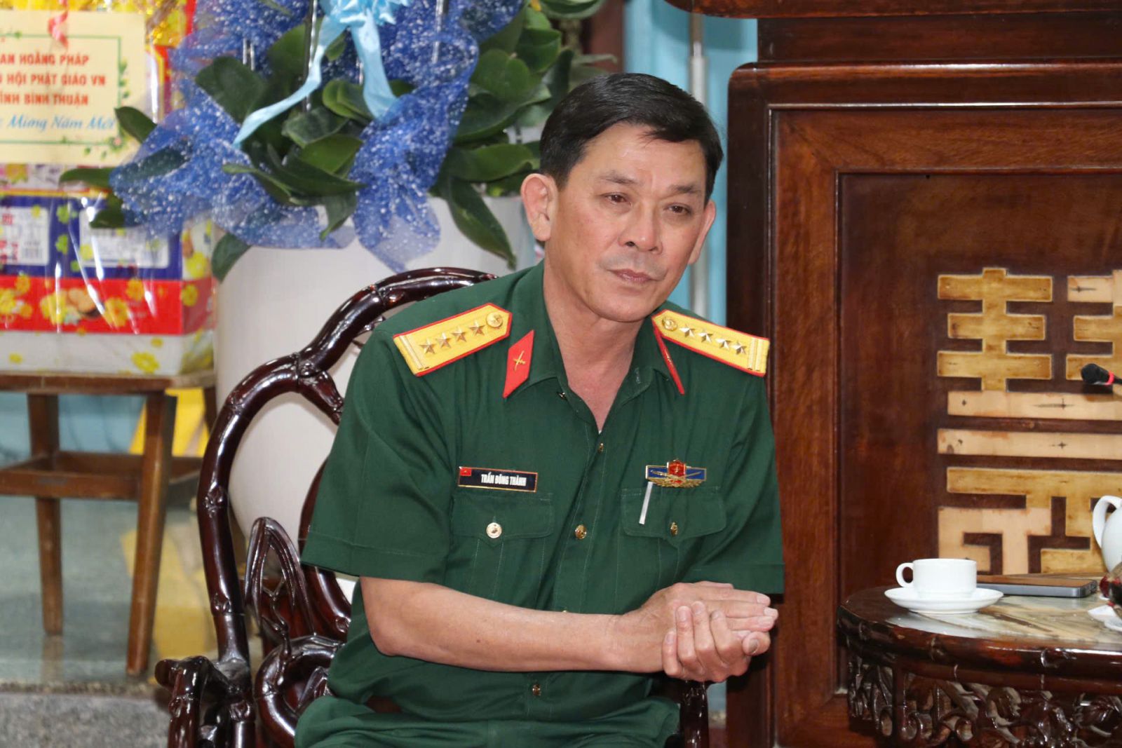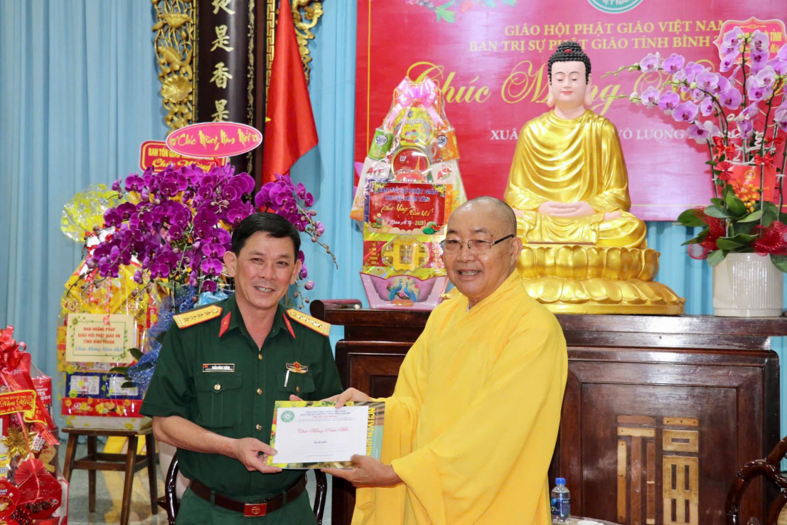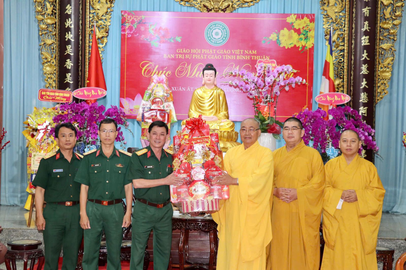 Đại diện đoàn, Đại tá Trần Đông Thành, Phó Chính ủy Bộ CHQS tỉnh Bình Thuận đã thay mặt Ban chỉ huy, cán bộ, quân nhân trực thuộc Bộ CHQS tỉnh gửi lời thăm hỏi và chúc mừng xuân Ất Tỵ đến Chư tôn đức Thường trực Ban Trị sự PG tỉnh.